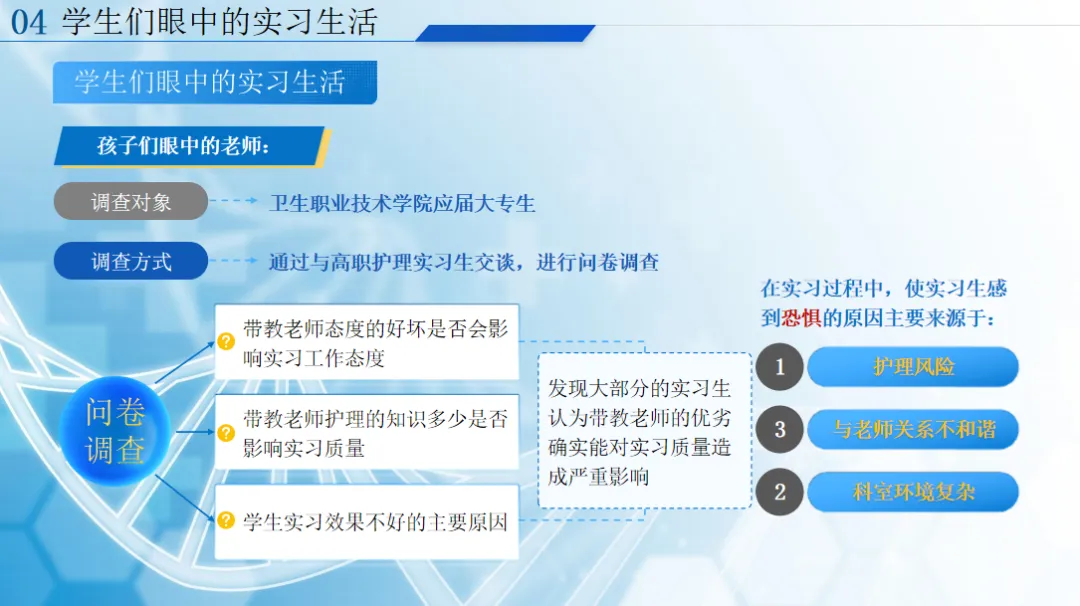 我们也要读懂护生的心声,护生眼中,带教老师的态度和能力直接影响实习质量,她们害怕护理风险、渴望被关心,希望老师能放手不放眼,多给建设性指导。而沟通不畅是师生间的主要问题,定期座谈就能有效拉近距离、消除隔阂。