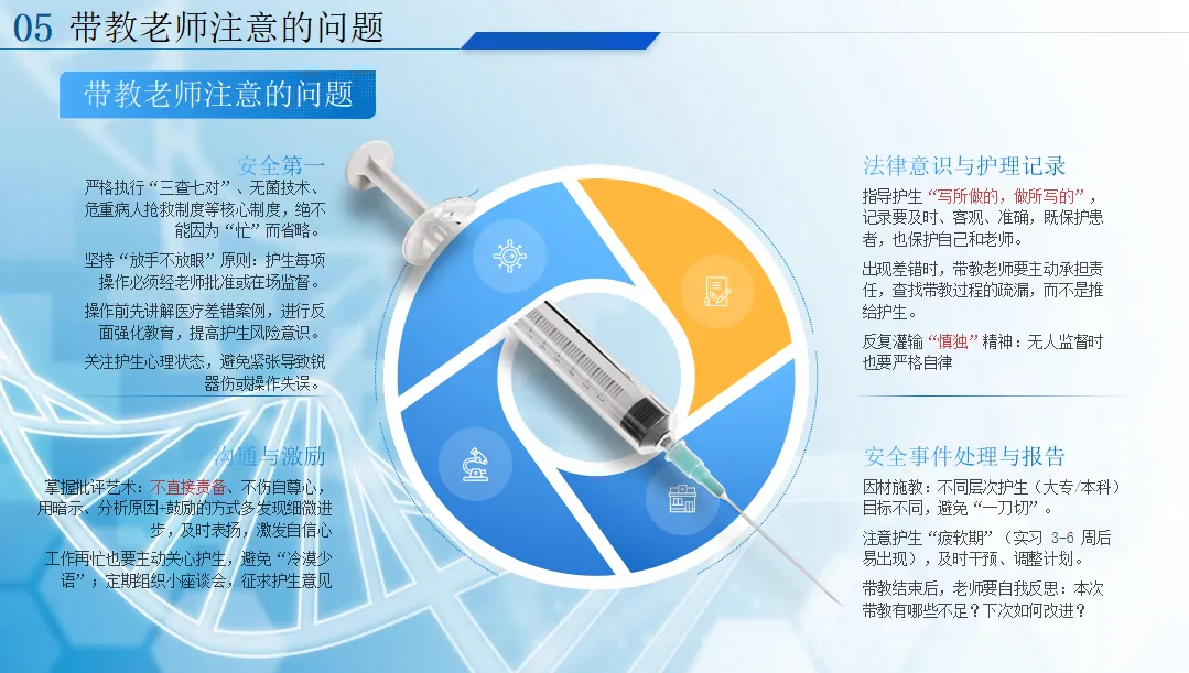 最后,带教还有这些关键点要牢记:安全第一,护生操作必须全程监督,强化风险意识;出现差错主动担责,不推诿;因材施教,关注护生心理和实习疲软期;掌握批评与激励的艺术,多肯定少指责;带教后及时反思,不断改进。