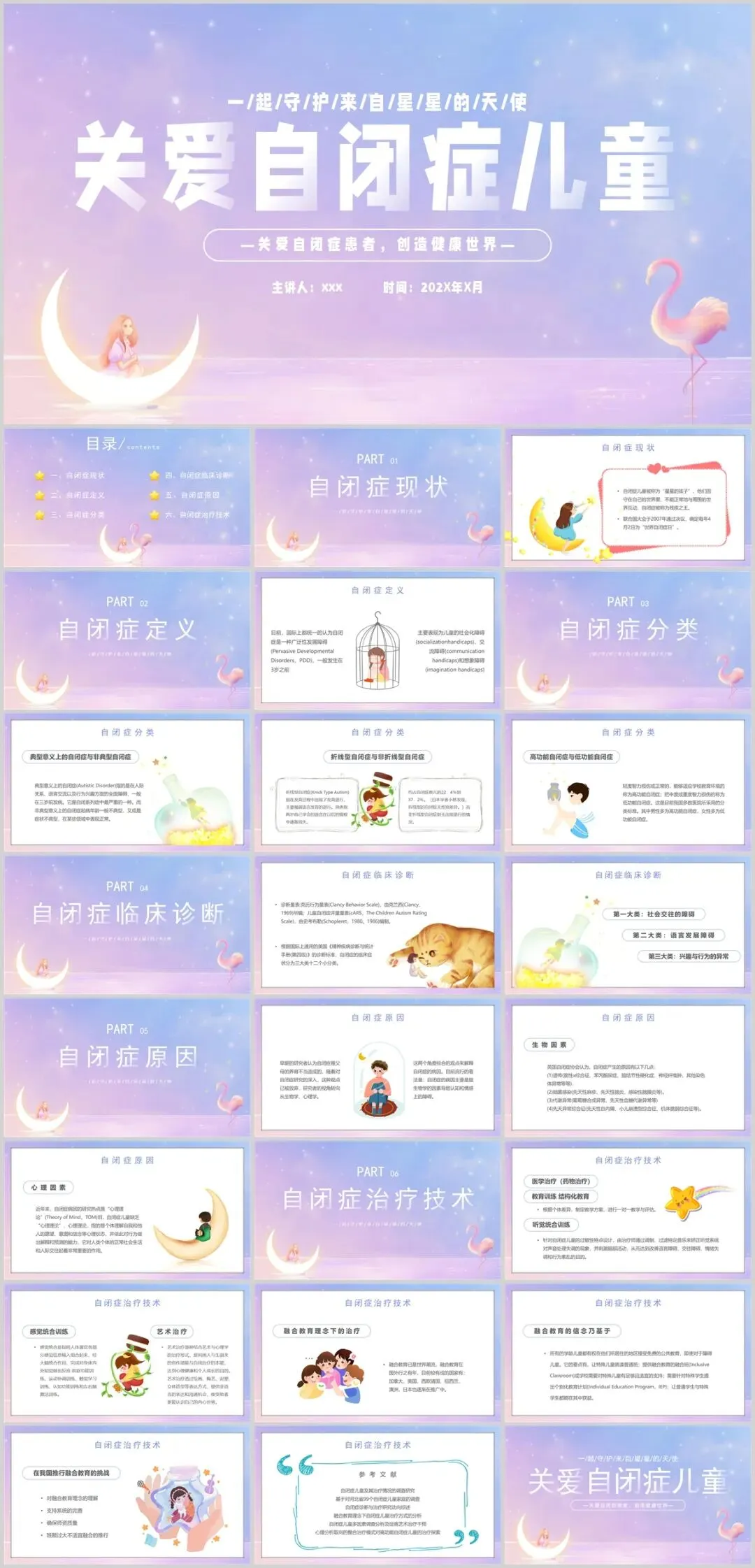 课件可包含家长指导页或家庭活动建议,帮助延伸学习。通过以上设计,课件不仅能传递自闭症相关知识,更能以友好、包容的方式帮助小朋友理解并接纳差异,从小培养同理心。5套自闭症主题PPT模板,免费下载方法如下: