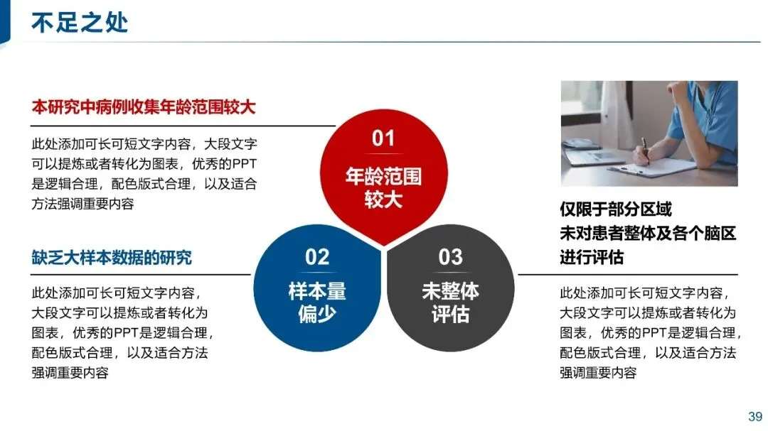 建议 :不足部分要体现“我已经意识到,并且知道怎么改进”,如“本研究为单中心回顾性设计,未来需多中心前瞻性验证”
