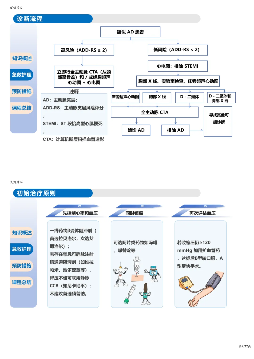 抢救夹层病人,降压是核心,但怎么降?PPT里专门做了一个“急救药物红绿灯表”。