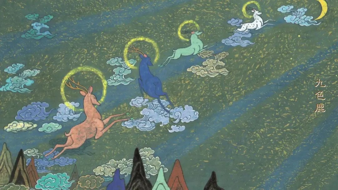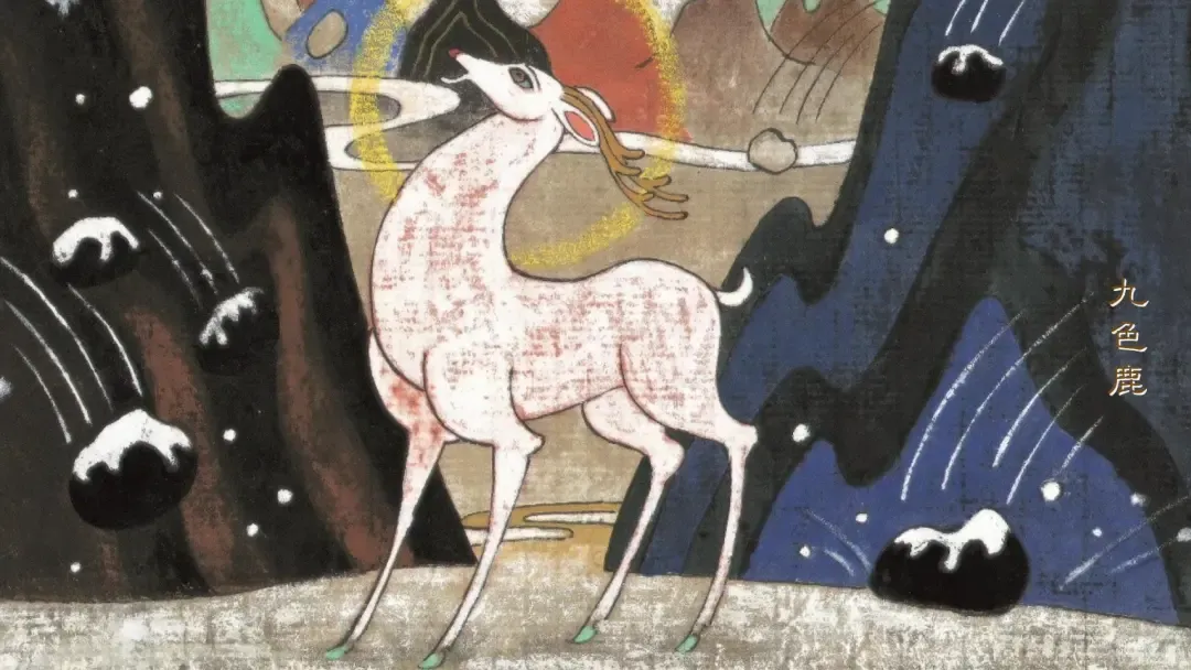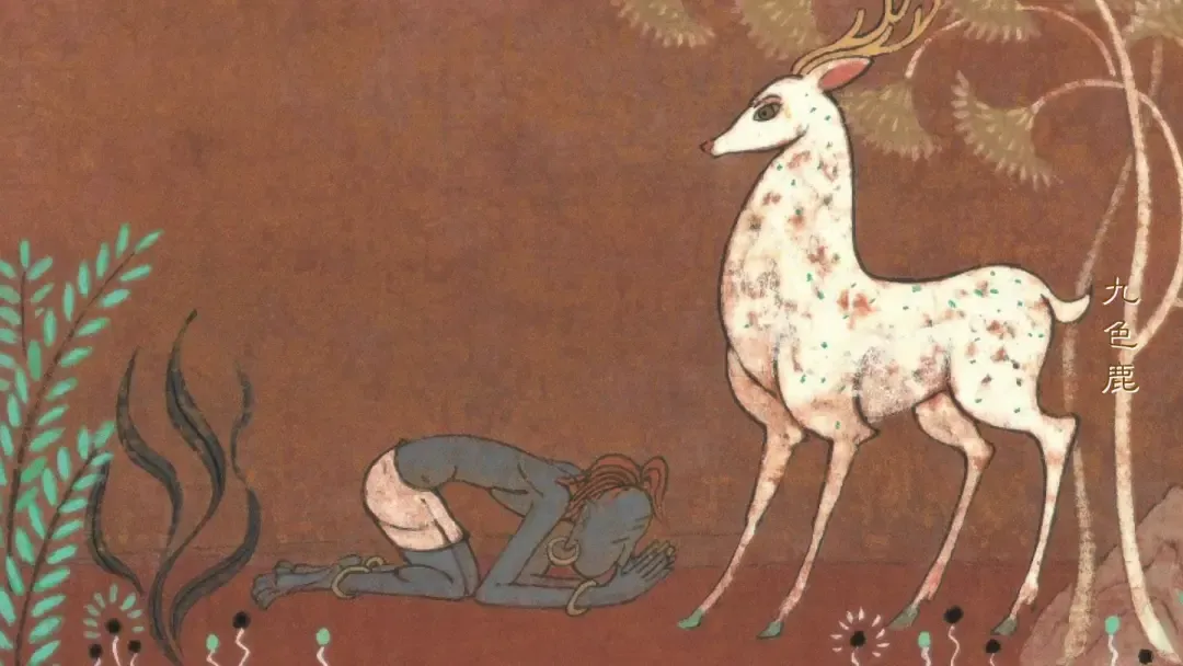 他们说:“当我们来到贵国的沙漠的时候,突然刮起了一阵刺骨的寒风,顿时飞沙走石,天昏地暗,我们迷失了方向。但是在这危急时刻,天边忽然出现了金色的光环,光环越跳越近,原来是一只九色鹿。它的皮毛洁白如雪,上面点缀着九色斑点,真的是美丽极了!我们见到九色鹿,又惊又喜,忙请神鹿指路,只见九色鹿抬头一声长鸣,倾刻之间,冰雪消融,一条大路就出现在我们的面前。”