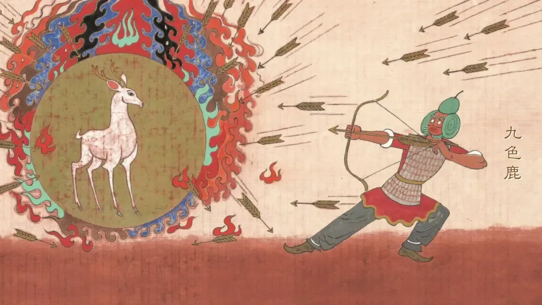 国王一听,急忙下令:“靠近点儿,射箭!”埋伏着的勇士们把九色鹿团团围住,射出了一支又一支的箭。