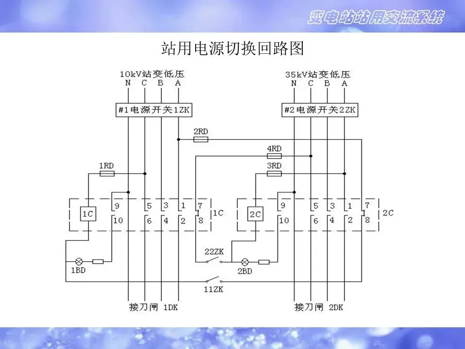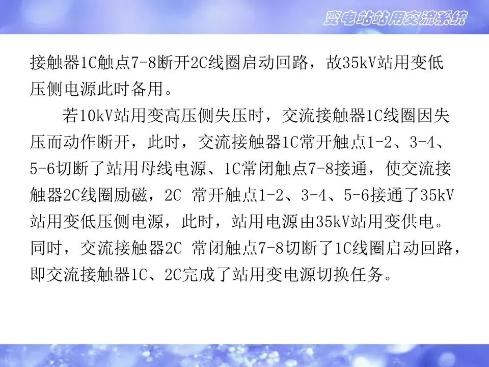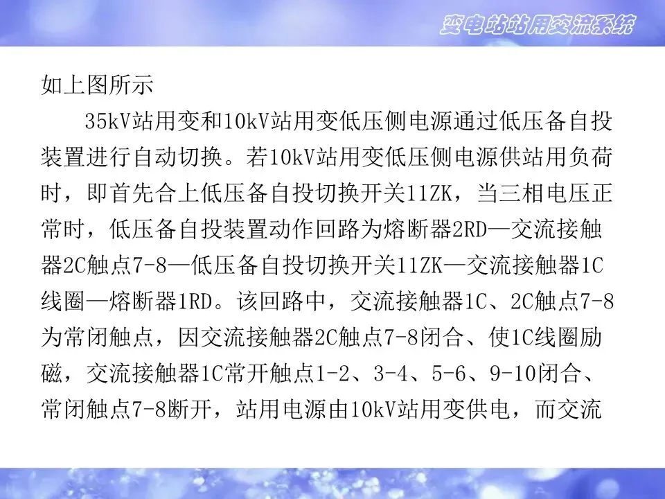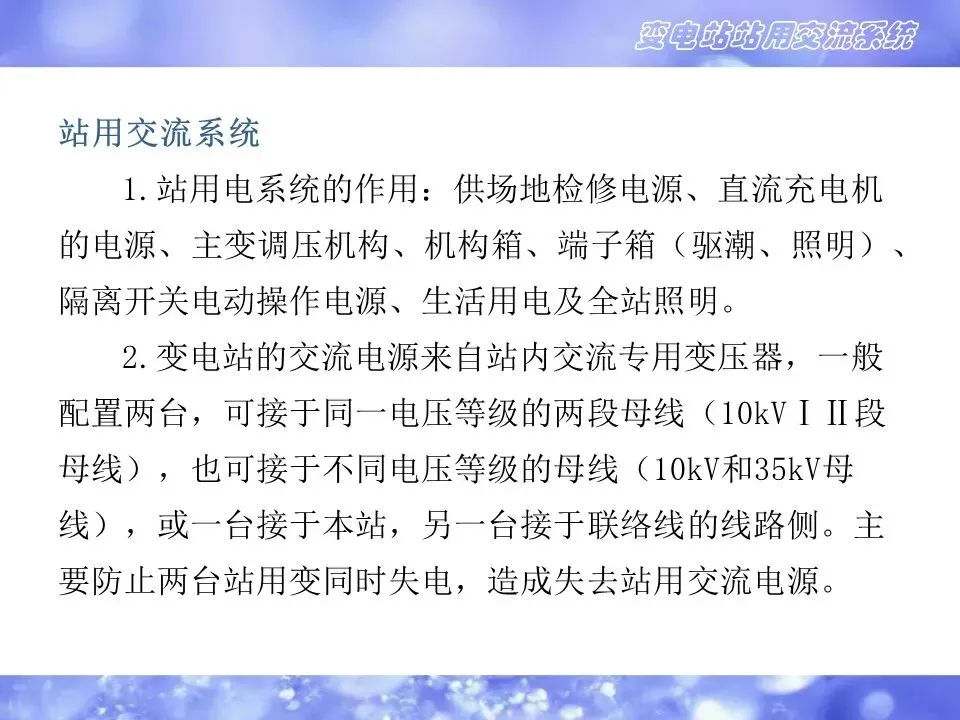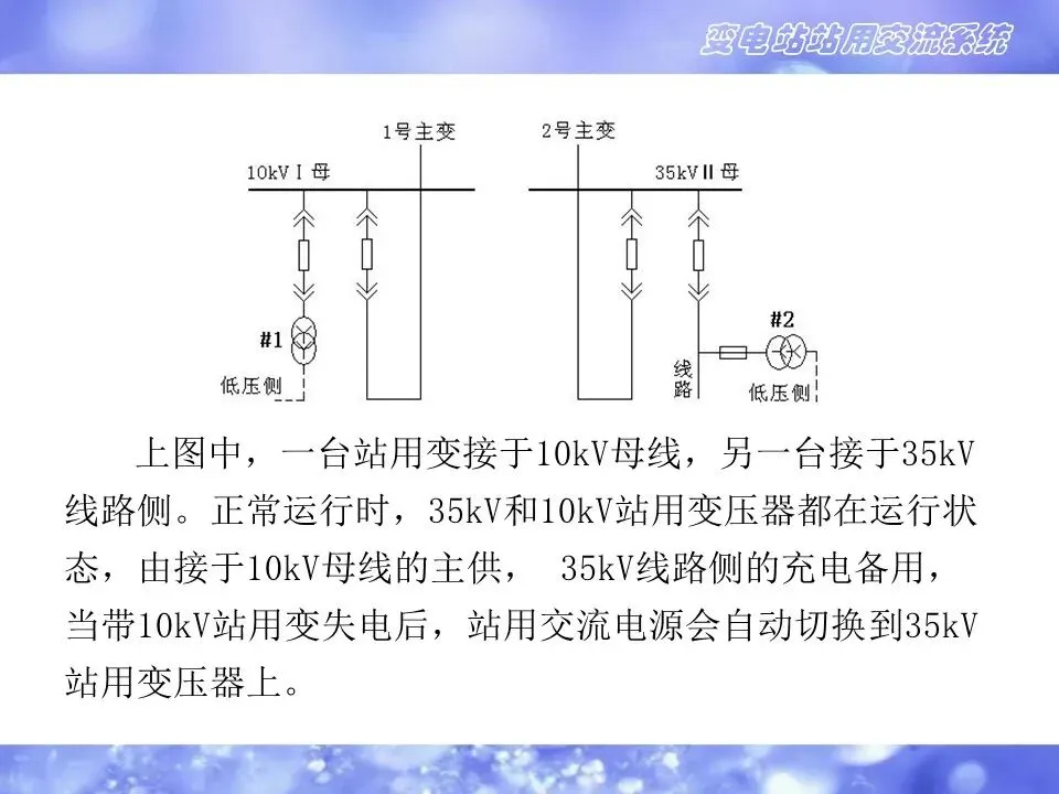 2.变电站的交流电源来自站内交流专用变压器,一般配置两台,可接于同一电压等级的两段母线(10kVⅠⅡ段母线),也可接于不同电压等级的母线(10kV和35kV母线),或一台接于本站,另一台接于联络线的线路侧。主要防止两台站用变同时失电,造成失去站用交流电源。