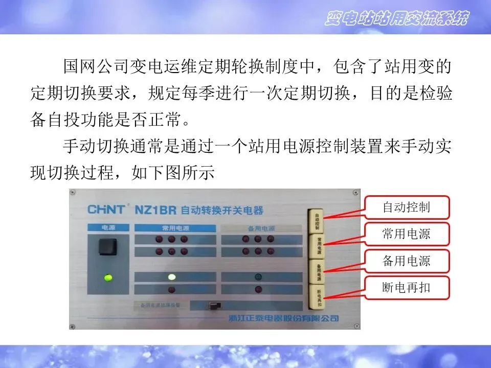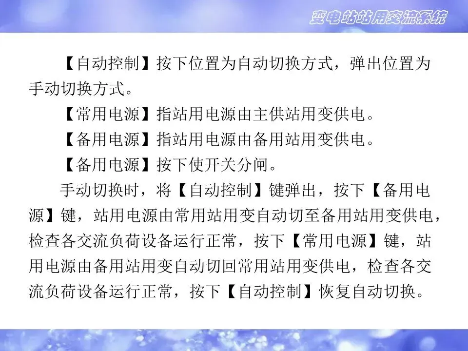 手动切换时,将【自动控制】键弹出,按下【备用电源】键,站用电源由常用站用变自动切至备用站用变供电,检查各交流负荷设备运行正常,按下【常用电源】键,站用电源由备用站用变自动切回常用站用变供电,检查各交流负荷设备运行正常,按下【自动控制】恢复自动切换。