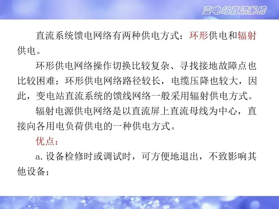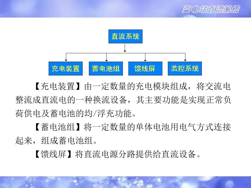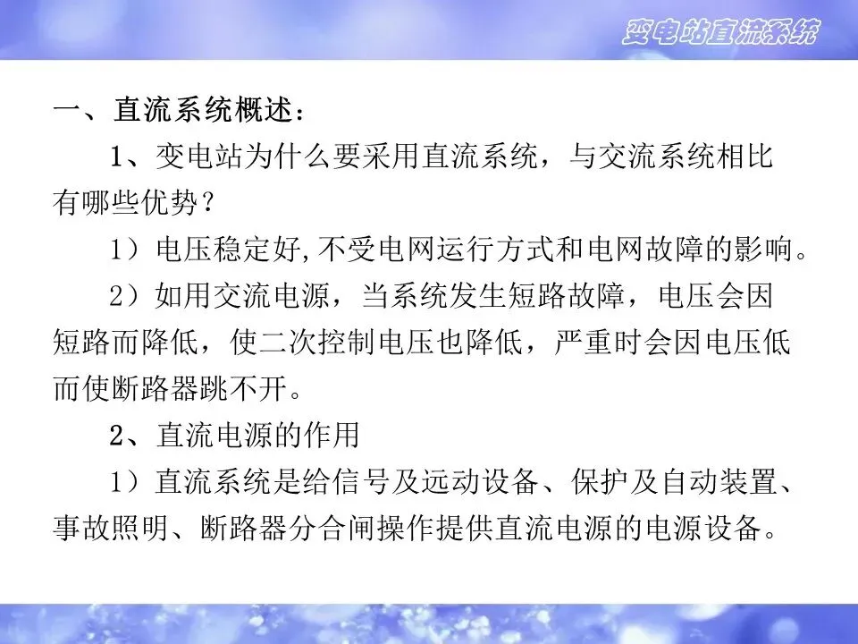 1)直流系统是给信号及远动设备、保护及自动装置、事故照明、断路器分合闸操作提供直流电源的电源设备。