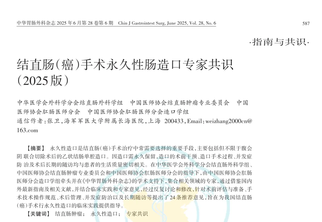 《结直肠 (癌) 手术永久性肠造口专家共识(2025 版)》由多学科专家联合制定,在国际平台完成注册,提出 24 条推荐意见,为结直肠癌永久性肠造口临床实践提供系统指导,核心围绕术前评估、手术操作、术后管理、并发症防治及长期随访展开,兼顾临床操作规范与患者生活质量提升。