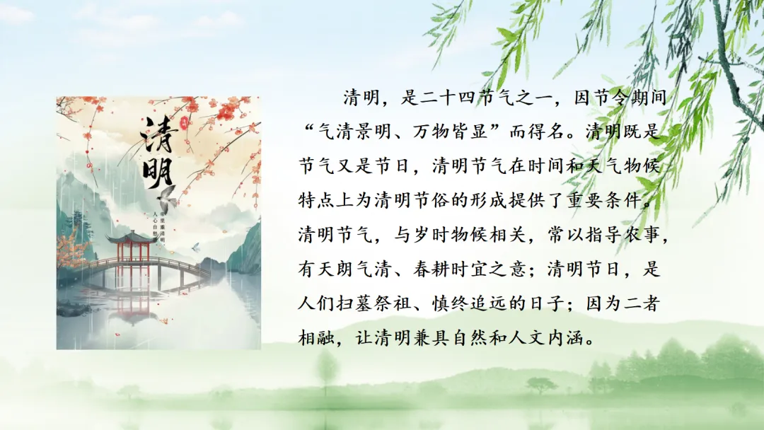 “万物生长此时,皆清洁而明净,故谓之清明。”在这仲春与暮春之交,我们迎来了既是节气又是节日的清明。今天,我们齐聚一堂,召开“清明寄相思,传承家国情”主题班会。让我们透过历史的烟云,共同探寻这个节日背后深沉的自然规律与厚重的人文精神。