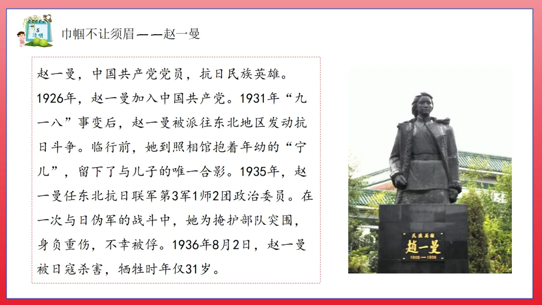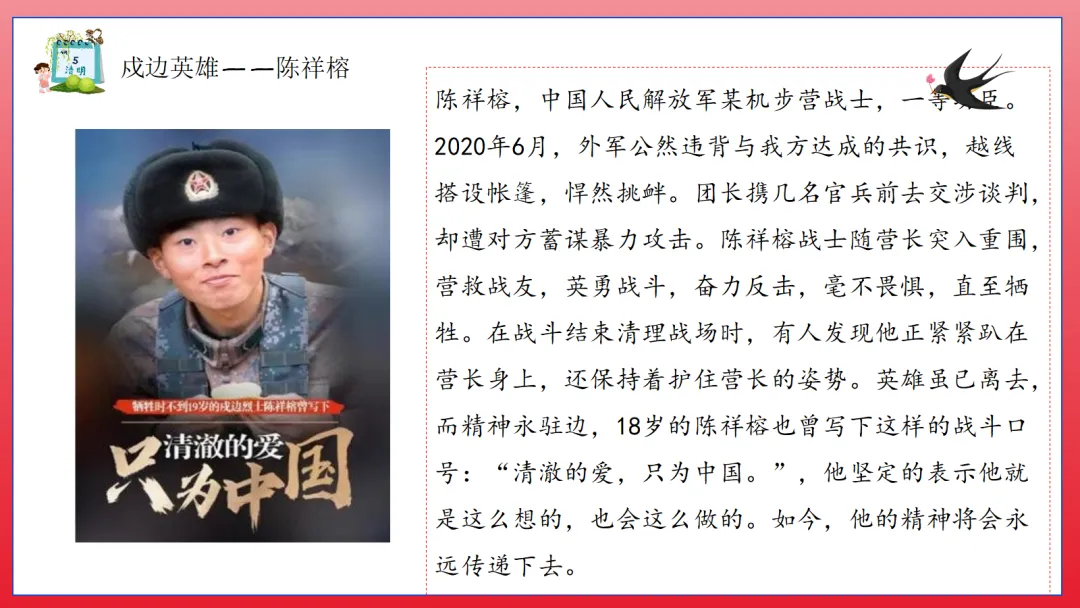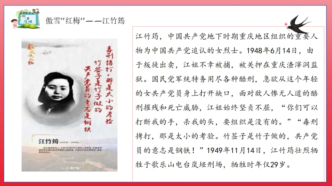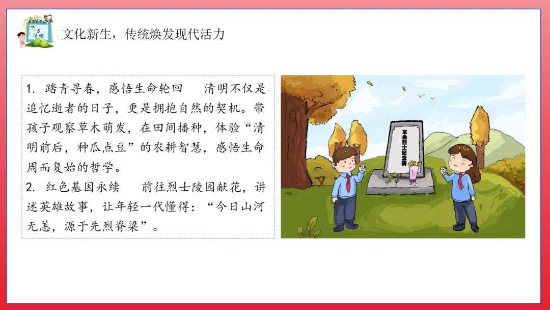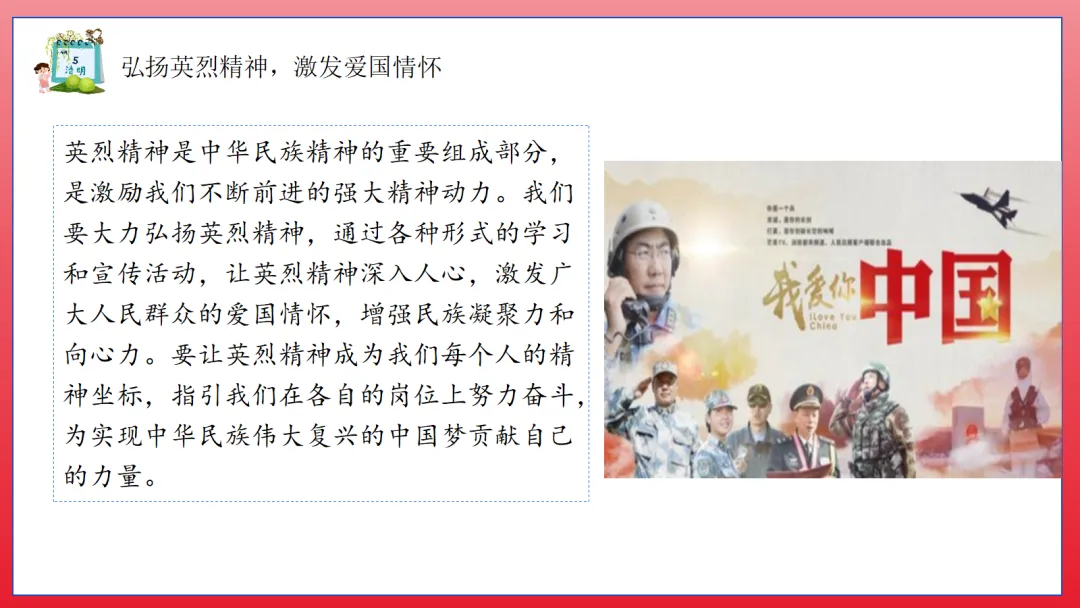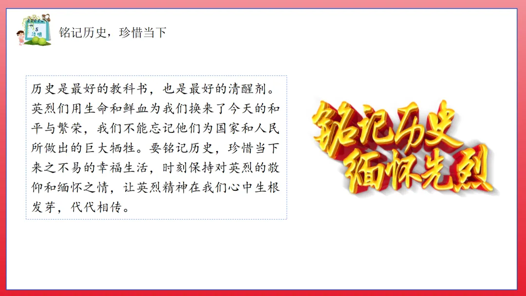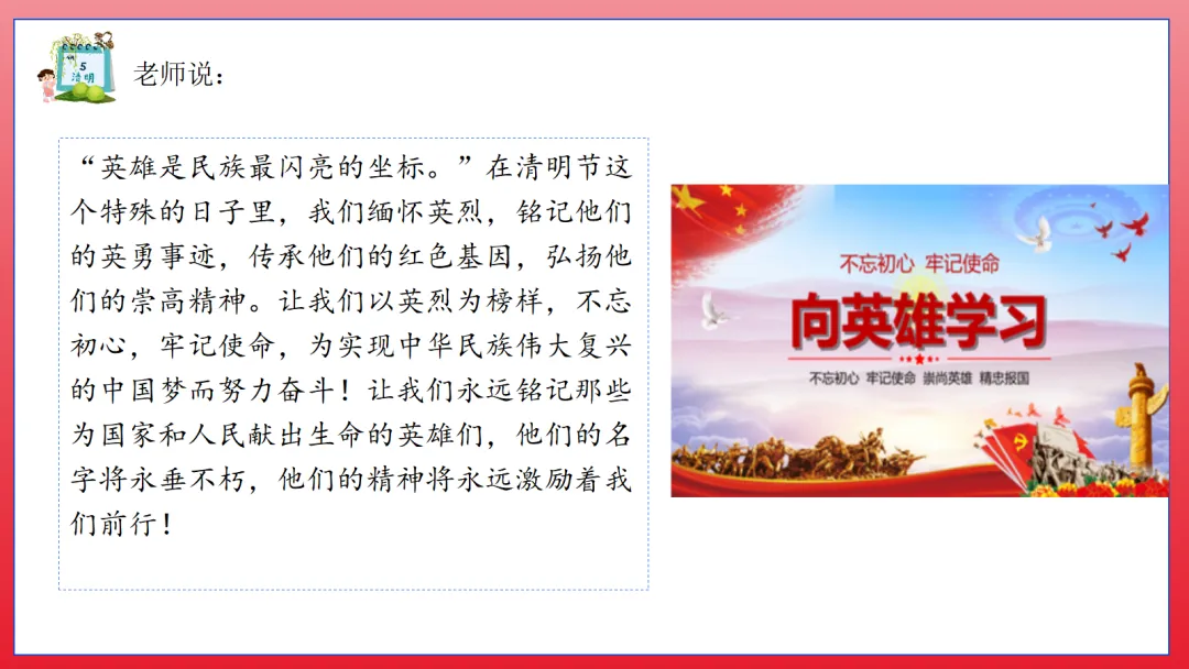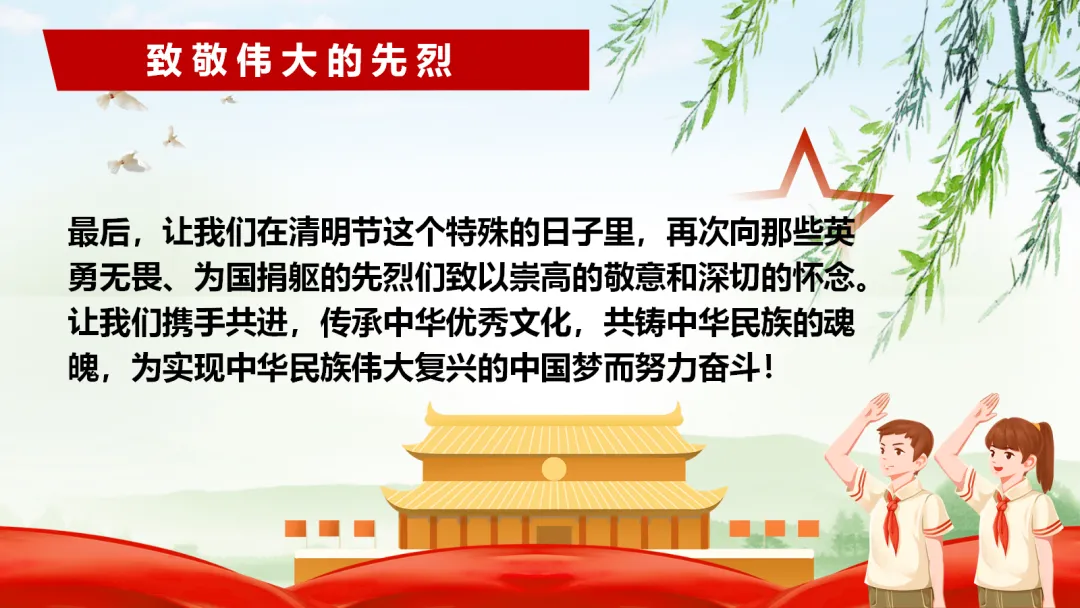 清明的意义,不仅在于祭奠自家的祖先,更在于致敬民族的英雄。在PPT中,我们看到了一个个闪亮的名字:有“甘将热血沃中华”的赵一堂,她在牺牲前留给儿子的唯一合影,是母爱,更是大爱;有傲雪红梅江竹筠,面对竹签钉指的酷刑,她高呼“共产党员的意志是钢铁”;有写下《可爱的中国》的方志敏,他在狱中依然坚信“中国一定有个可赞美的光明前途”;还有那写下“清澈的爱,只为中国”的戍边英雄陈祥榕,以及为了捍卫祖国领空而壮烈牺牲的海空卫士王伟。同学们,今天我们脚下的每一寸土地,头顶的每一片蓝天,都是他们用生命换来的山河无恙。