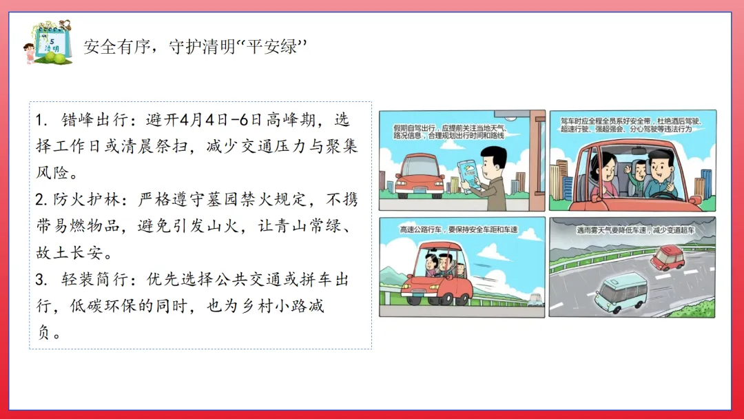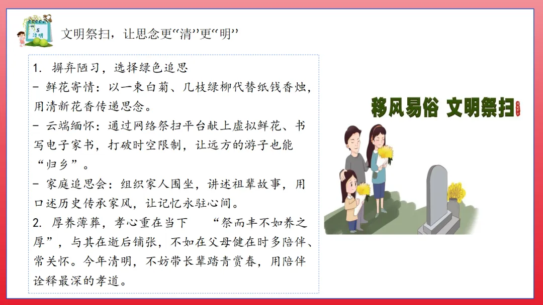 缅怀先人,重在心诚,不在形式。在这个清明,我们向大家发出倡议:一要文明祭扫。 摒弃烧纸钱的陋习,选择鲜花寄情、云端缅怀或家庭追思会,让思念更“清”更“明”。二要厚养薄葬。 “祭而丰不如养之厚”,趁着父母长辈健在时多陪伴、常关怀,这才是最大的孝道。三要安全有序。 错峰出行,严守禁火规定,注意交通安全,守护清明的“平安绿”。四要感悟生命。 在踏青中体验“清明前后,种瓜点豆”的农耕智慧,感悟生命的周而复始。