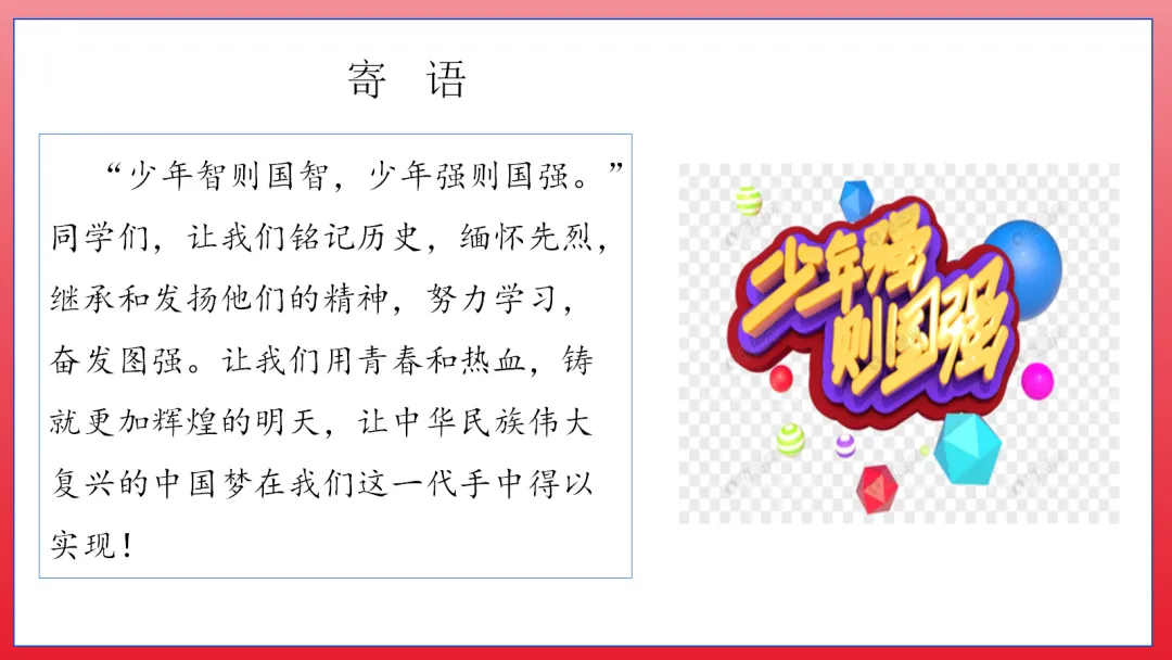 同学们,“少年智则国智,少年强则国强”。让我们在这个清明节,既低头追思先人,也抬头仰望星空。让我们铭记历史,缅怀先烈,以青春之我,创建青春之国家!