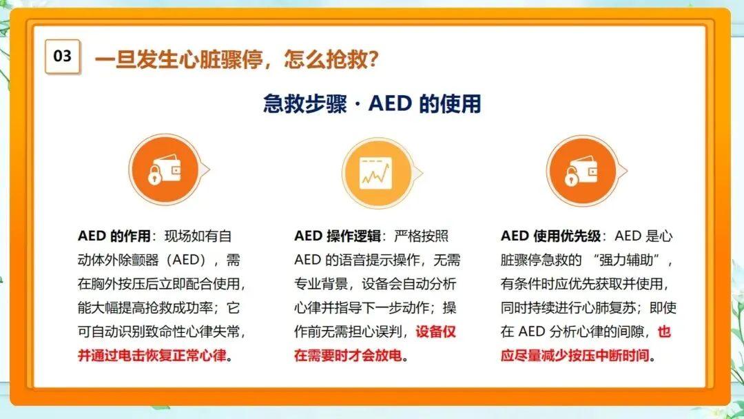 第三步:AED除颤。 如果现场有自动体外除颤器(AED),请立刻使用。AED操作简单,只需开机听语音提示,它能自动分析心律并指导电击,是抢救的“强力辅助”。