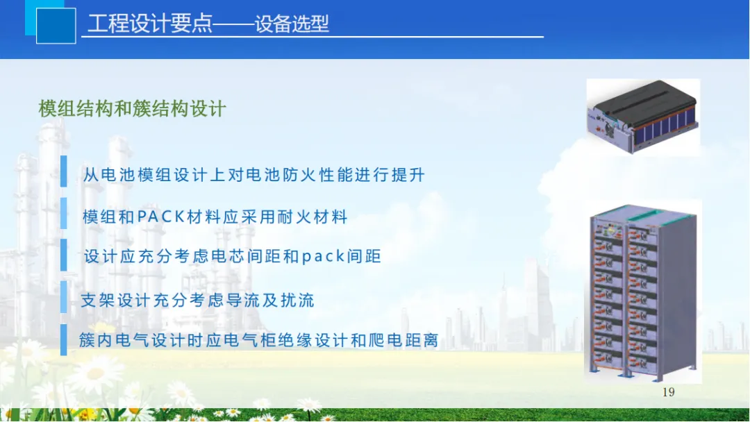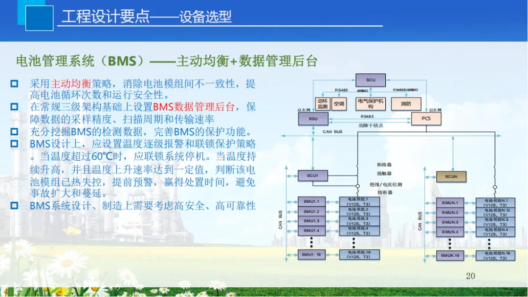 工程设计需聚焦关键要素:电池选型优先磷酸铁锂电池,其高温稳定性和安全性更优;电池管理系统采用主动均衡策略,设置温度逐级报警与联锁保护;