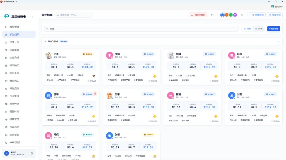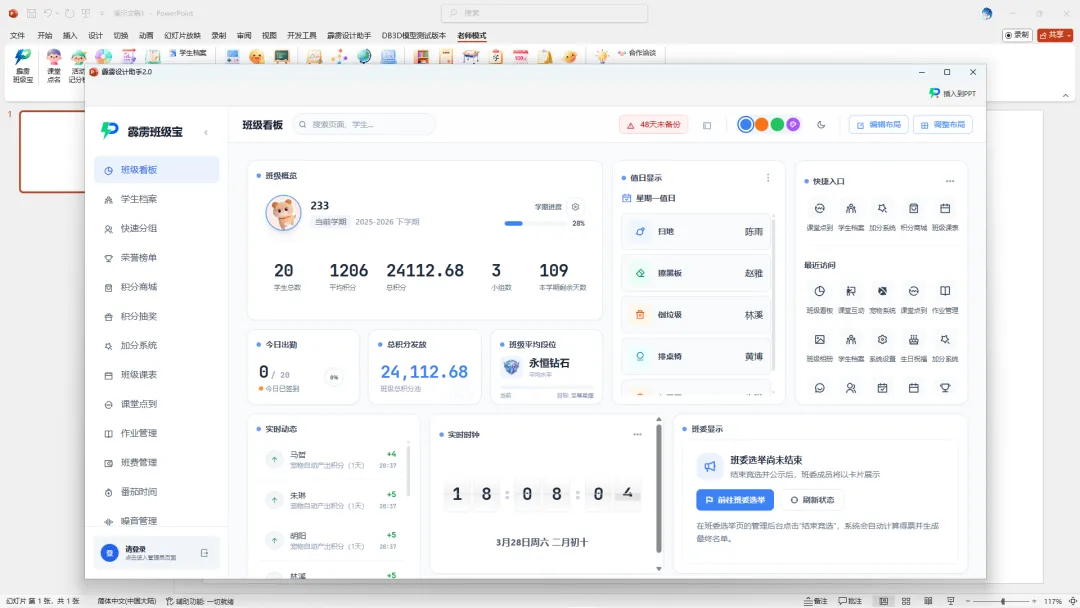 传统 Excel 管理学生档案,本质是 “记录信息”;而霹雳班级宝的数字化学生档案,核心是 “解读学生”。并且这一切你都不需要安装过多的软件去实现,全部在PPT软件实现!如果教师有电子白板,而霹雳设计助手PPT插件就是最好的搭配!它不仅解决了 “信息分散、查询低效” 的表层痛点,更通过 “数据整合、标签关联、动态更新”,让班主任能精准把握每个学生的成长轨迹,为个性化教育提供数据支撑。