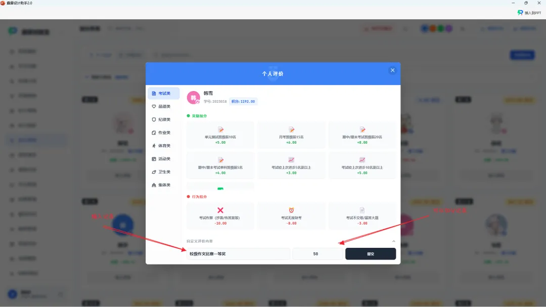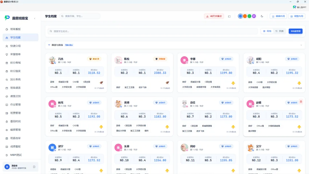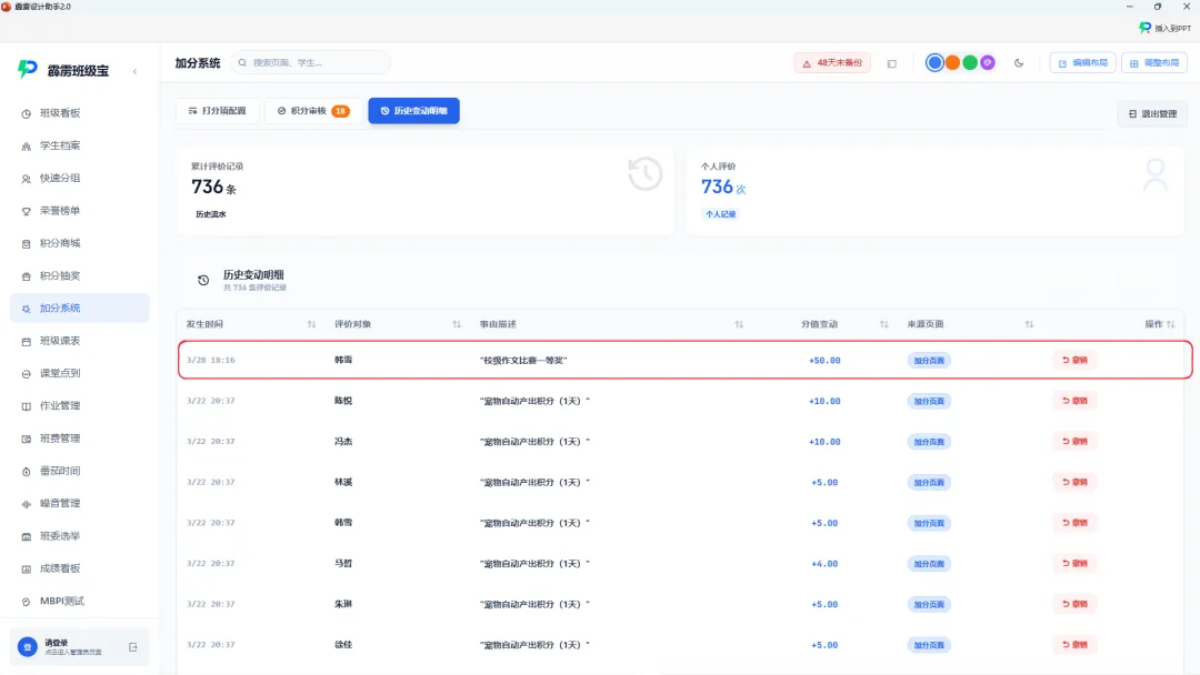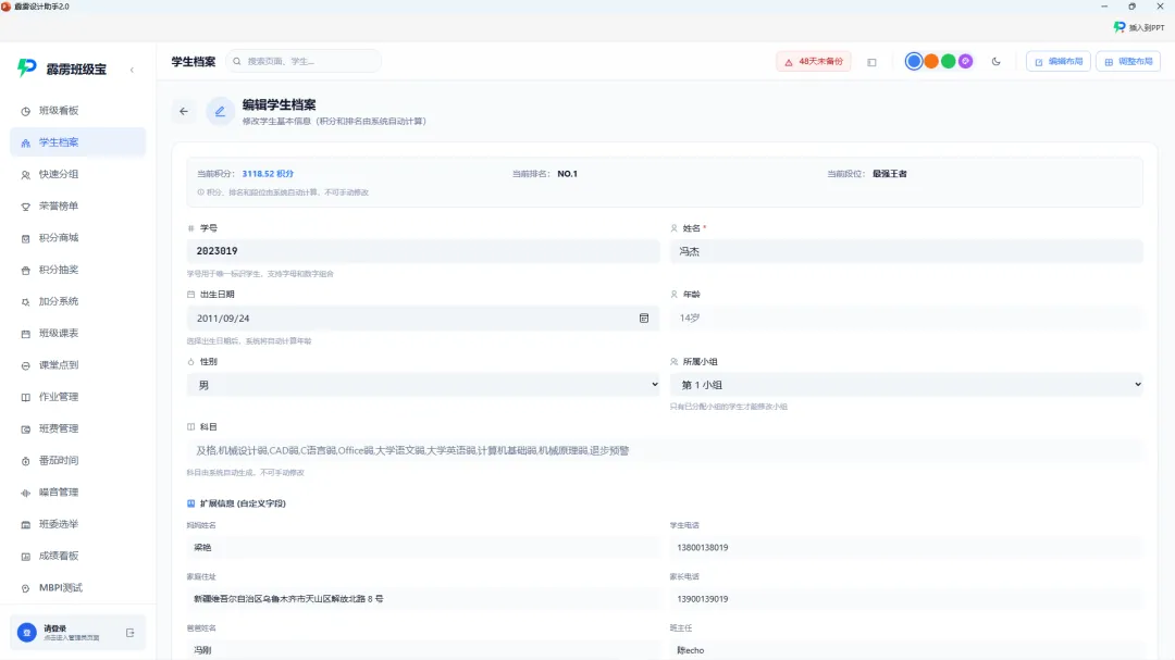 Excel 管理档案的最大痛点是 “更新繁琐,不是什么都方便记录的”—— 修改一名学生的家庭联系方式,需要同步修改基础信息表、紧急联系人表、家长会签到表等多个文件,稍不注意就会出现 “数据不一致”。而霹雳班级宝的学生档案系统,实现了 “一次更新,全系统同步”:信息修改实时生效:家长告知更换手机号,刘老师在学生档案里修改后即可,无需额外操作。行为记录自动追加:学生获得 “校级作文比赛一等奖”,老师在加分系统添加 “获奖记录”,系统自动同步到加分和加分记录中,学生还能得到整个班级的肯定!历史数据全程追溯:每个字段的修改记录都有迹可循,比如学生的 “数学薄弱” 标签何时添加、何时取消,成绩数据的每次变动,都能查看历史版本,避免 “数据篡改” 或 “记录丢失”。第四步:PPT 插件联动,档案成果 “可视化展示”