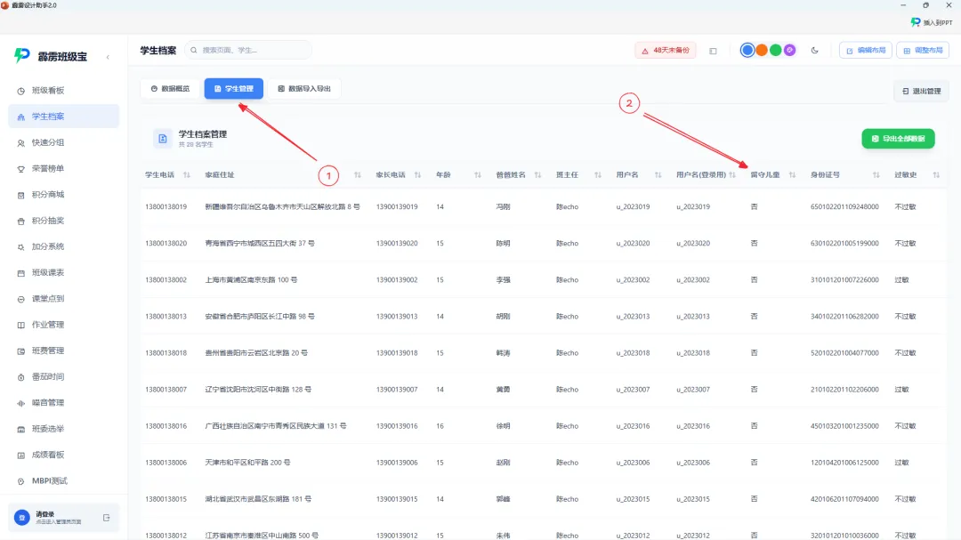霹雳班级宝的学生档案系统,打破了 Excel 的 “信息孤岛”,将学生的所有信息整合为 “一站式数字画像”:基础信息一键录入:姓名、性别、出生日期、家庭联系方式等基础数据,可批量导入或单个添加,避免 “信息遗漏”;动态标签自动关联:刘老师不再需要手动在表格里标注 “内向”“数学薄弱”“体育特长”,而是通过系统预设的标签库,或自定义标签,在日常管理中随时添加 —— 比如发现学生 “主动帮助同学”,就在档案里添加 “乐于助人” 标签;数学测试连续两次失分率超 30%,系统自动关联 “数学薄弱” 标签;多维度数据自动同步:学生的出勤记录(来自课堂点到功能)、作业完成情况(来自作业管理功能)、积分变动(来自加分系统)、成绩数据(来自成绩看板),都会自动同步到学生档案,无需手动录入。“现在我录入一名学生的信息,只需要在霹雳班级宝里操作一次,所有相关数据都会自动关联。” 老师演示道,“比如查看学生小宇的档案,一屏就能看到:基础信息(10 岁,单亲家庭)、个性标签(内向、逻辑思维强、英语薄弱)、行为记录(本周出勤全勤,2 次未完成数学作业,3 次课堂发言加分)、成绩趋势(近三次测试英语成绩从 72 分提升至 85 分),再也不用切换多个表格了。”第二步:智能查询筛选,效率提升 10 倍