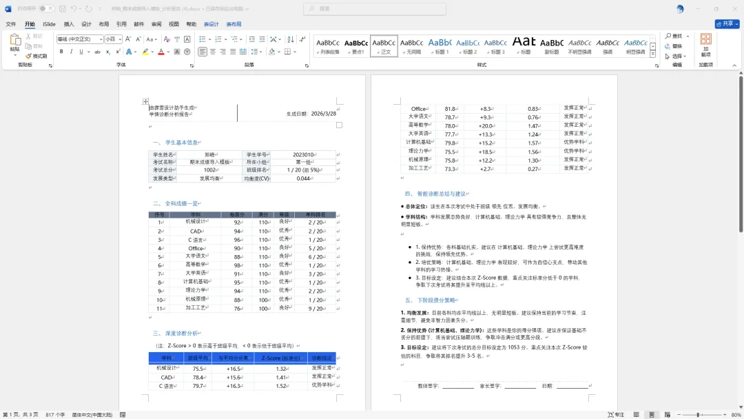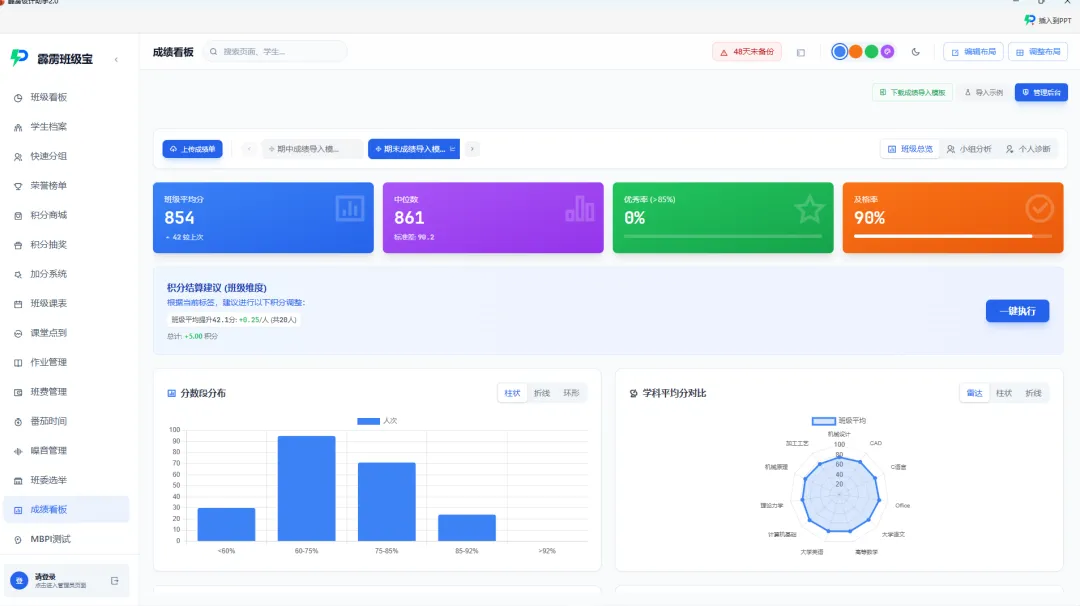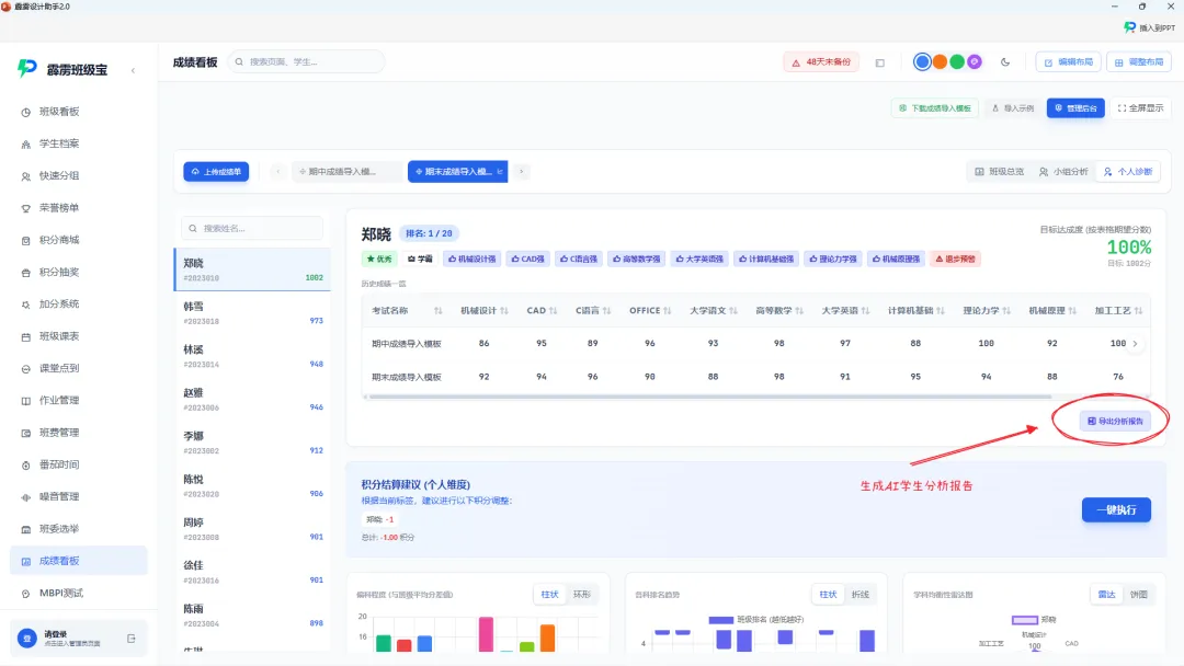 如果说“学生成绩”看板是 “数据后台”,那么“学生档案”就是 “展示前台”,让数字化成绩档案从 “后台数据” 变为 “可视化成果”学生成绩信息一键生成学生成绩报告:开家长会时,老师需要向家长展示学生的成长情况,只需在霹雳班级宝中选中对应学生,通过 PPT 插件一键导出 “学生成长报告”。包含成绩趋势图表、行为表现标签,插件的AI自动生成美观的可打印,可签字的word分析文档,无需手动排版;从 “数据搬运工” 到 “教育分析师”,效率与深度双提升
