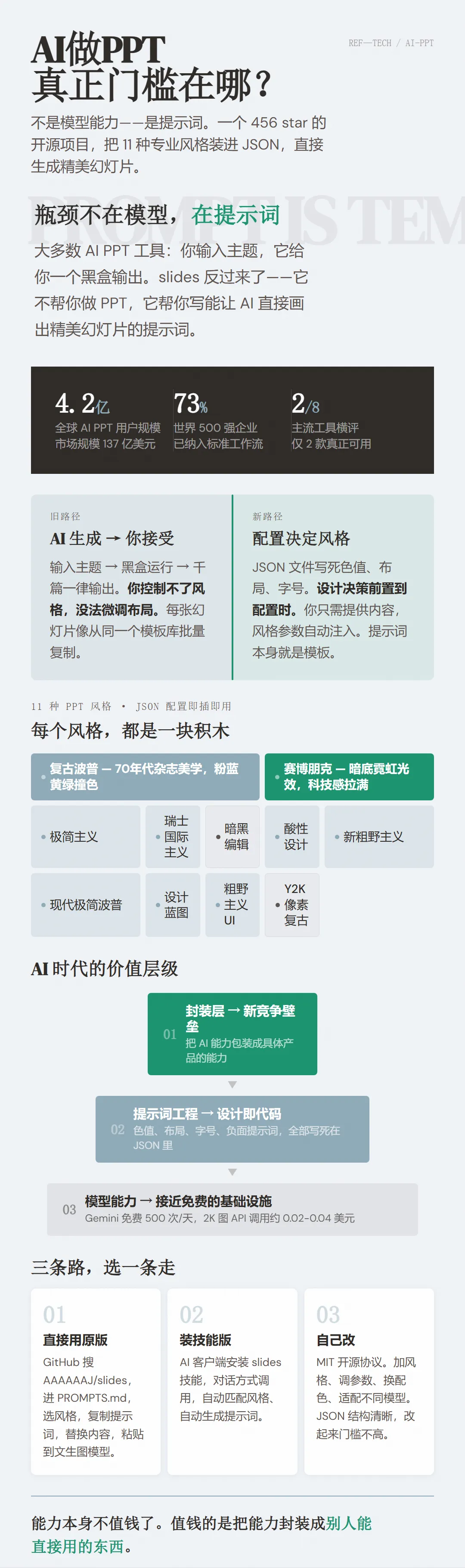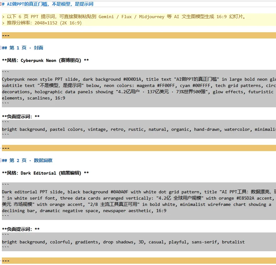 直接用原版。 打开GitHub搜"AAAAAAAJ slides",进PROMPTS.md,选风格,复制提示词,替换标题和数据,粘贴到任何文生图模型里。