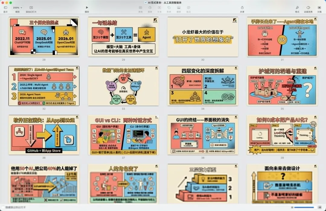 这件事不需要写代码。改造完的slides技能在AI客户端里直接对话就能用。未来会有越来越多这样的积木出现。