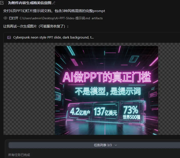 实际体验是这样的:我在AI客户端里说"帮我生成一页关于AI行业趋势的幻灯片",slides技能会自动根据内容判断风格,输出完整的图像生成提示词。我复制提示词,粘贴到文生图模型里,几秒钟出图。