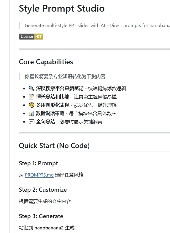 项目做的事情,用一句话就能说清楚——生成PPT幻灯片的提示词。