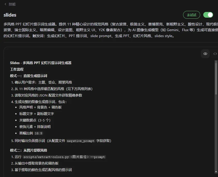 装技能版。 如果你的AI客户端支持通用skill格式,安装slides技能后用对话方式调用,自动匹配风格、自动生成提示词。
