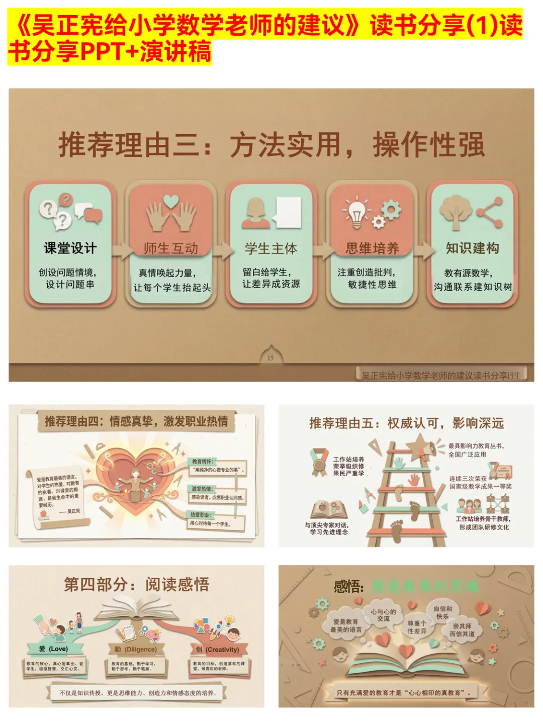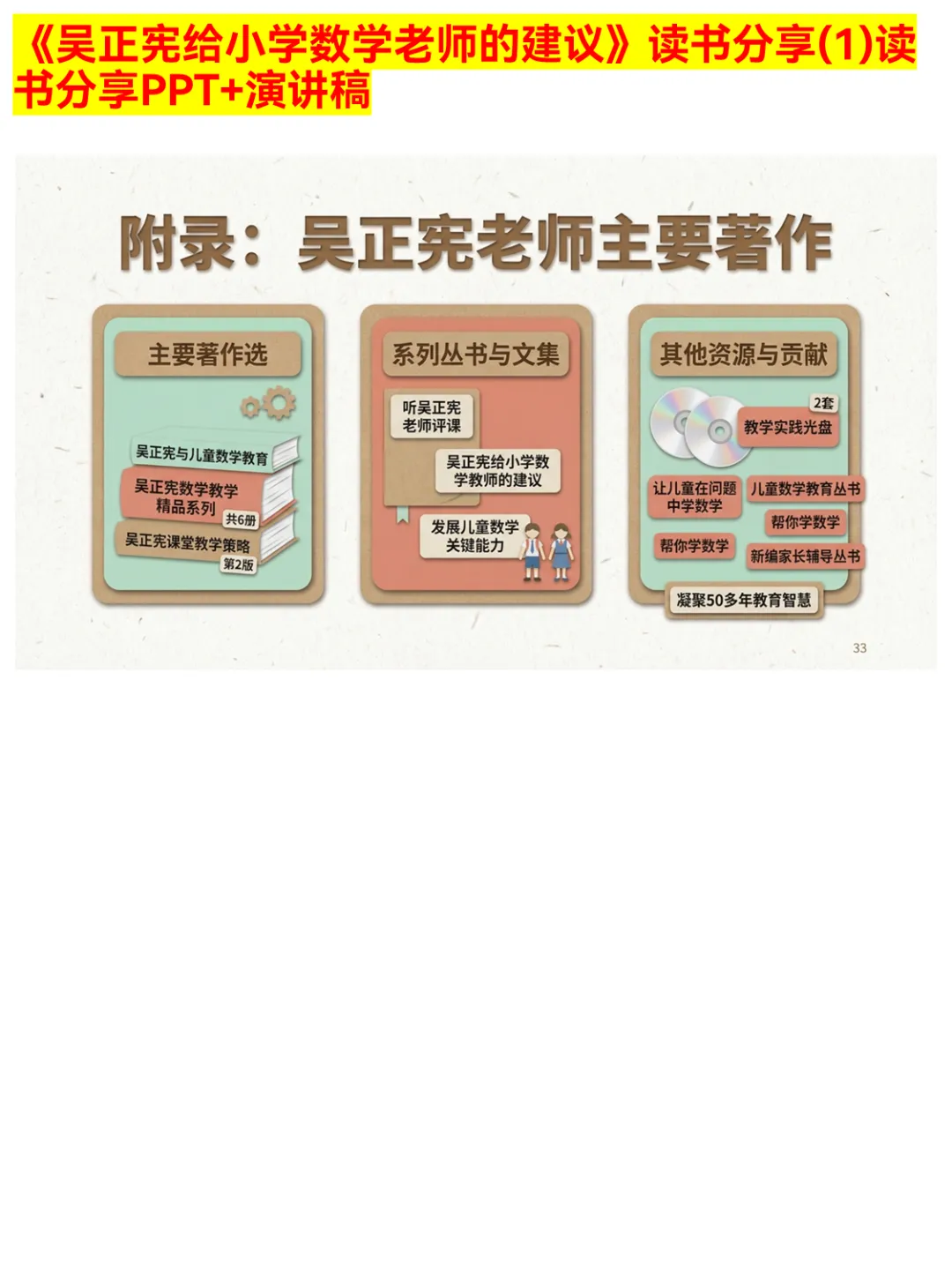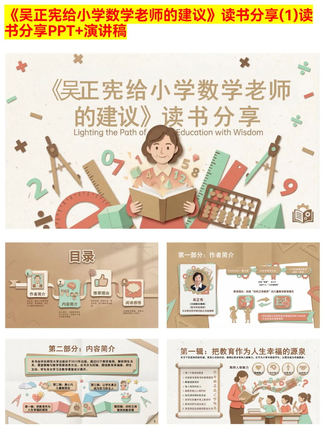 强烈推荐给小学数学老师!《吴正宪给小学数学老师的建议》读书分享PPT,52个生动案例+先进教育理念,从师德修养到课堂实操,从学生自主学习到创新精神培养,全方位助力教师提升。不管是新手老师还是资深教师,都能从中收获满满,让数学课堂既“好吃”又有营养~ #小学数学老师 #吴正宪教学建议 #教师成长PPT #教学案例干货 #课堂优化技巧 #儿童数学课堂 #教师专业提升 #教育理念分享 #数学教学策略 #读书分享PPT