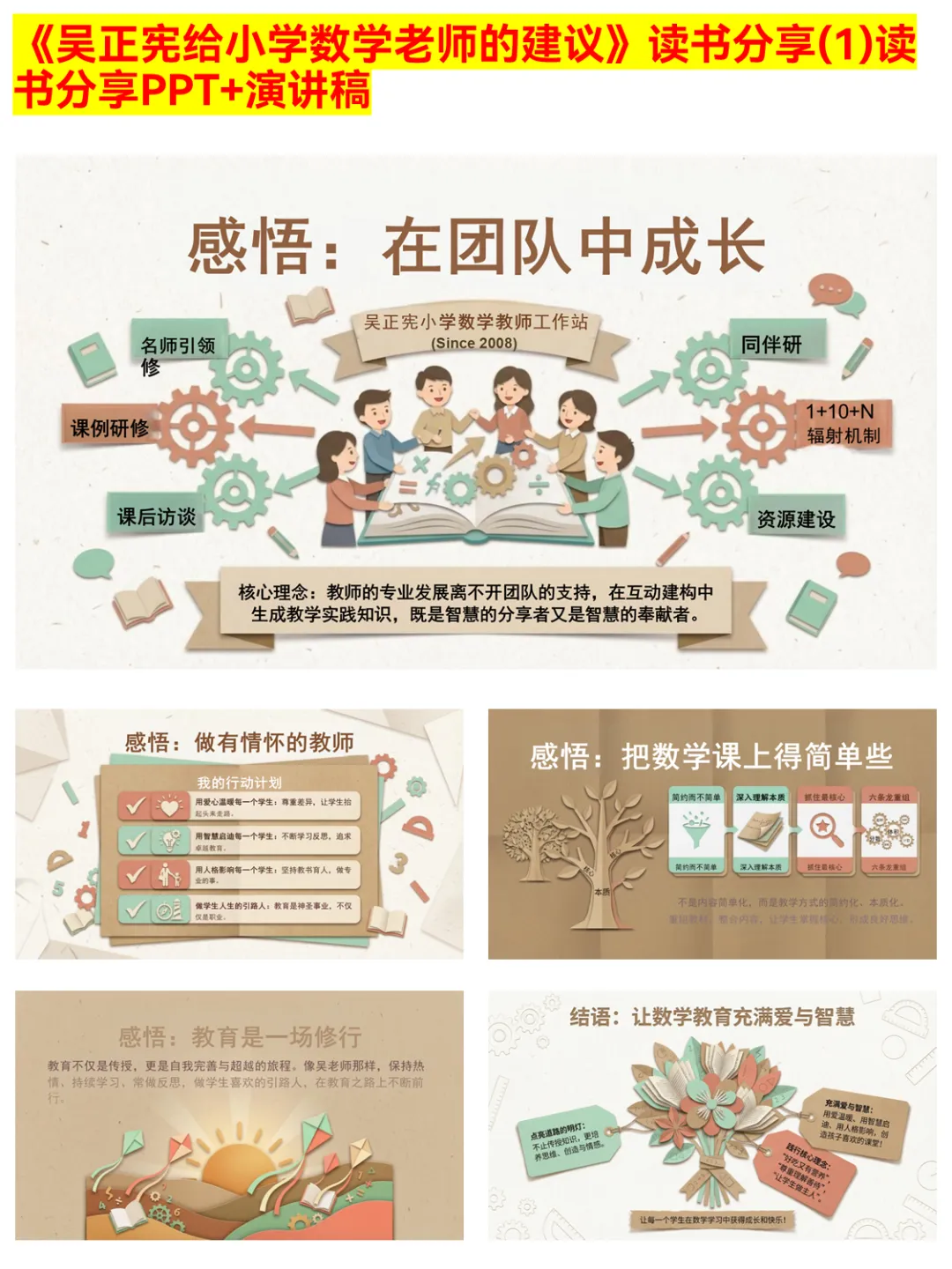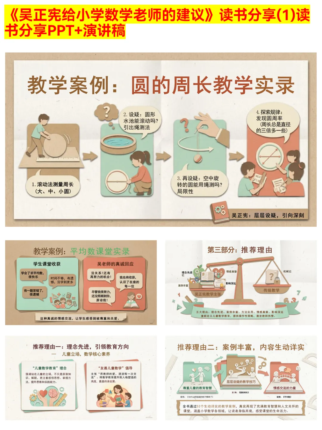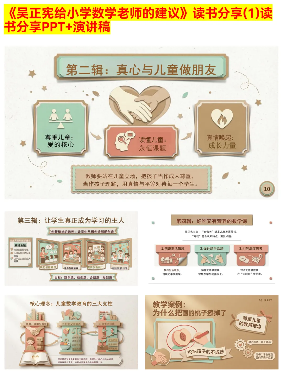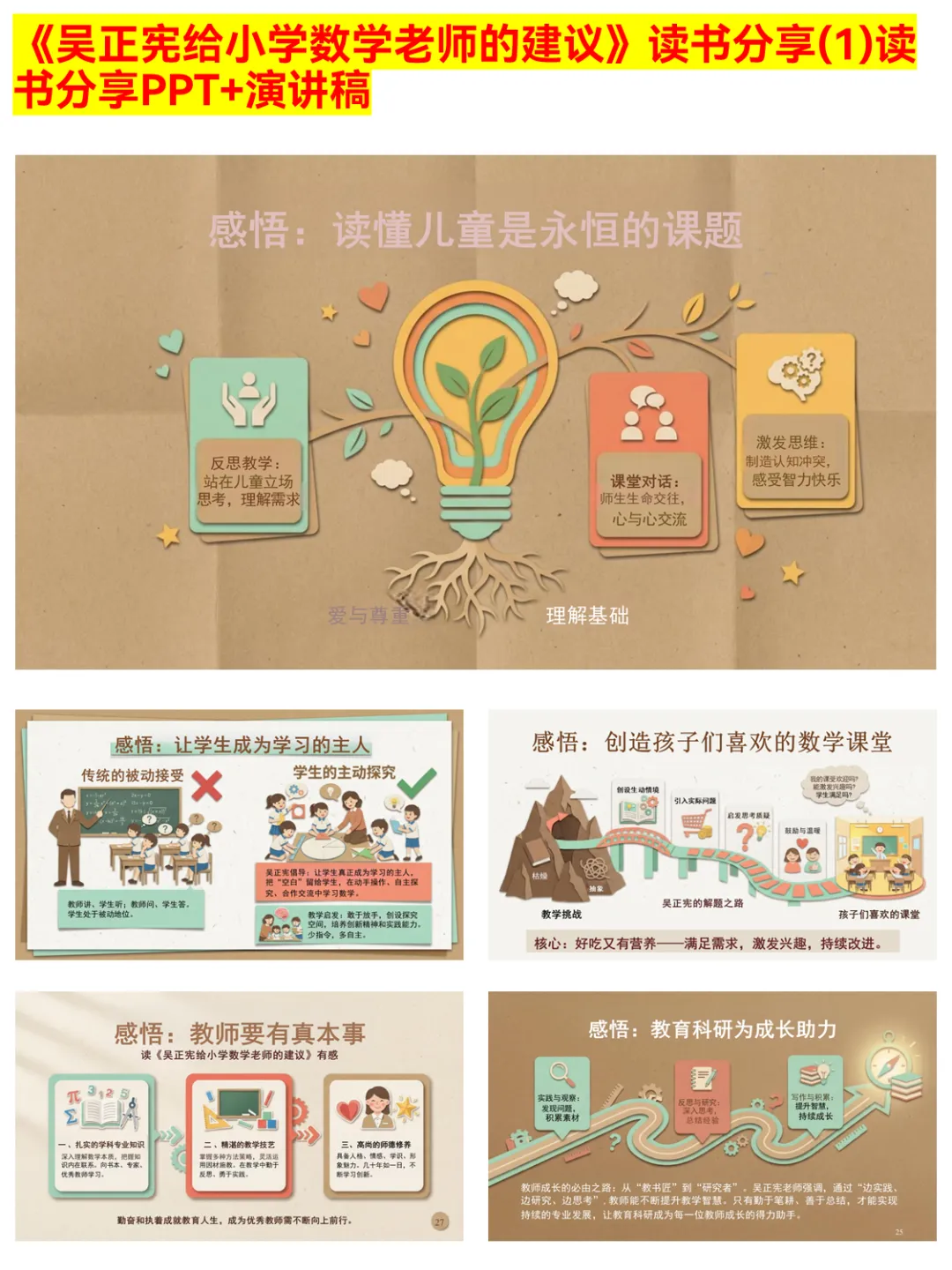 强烈推荐给小学数学老师!《吴正宪给小学数学老师的建议》读书分享PPT,52个生动案例+先进教育理念,从师德修养到课堂实操,从学生自主学习到创新精神培养,全方位助力教师提升。不管是新手老师还是资深教师,都能从中收获满满,让数学课堂既“好吃”又有营养~ #小学数学老师 #吴正宪教学建议 #教师成长PPT #教学案例干货 #课堂优化技巧 #儿童数学课堂 #教师专业提升 #教育理念分享 #数学教学策略 #读书分享PPT