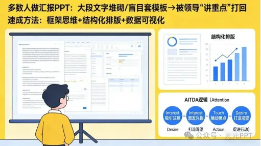 但多数人做汇报PPT 时,要么大段文字堆砌,要么盲目套模板,最终被领导一句 “讲重点” 打回重做。其实,做好汇报 PPT 并非靠设计天赋,而是有可复制的速成方法,从草稿梳理到成品落地,遵循AITDA 逻辑(Attention 吸引注意 - Interest 激发兴趣 - Touch 触动痛点 - Desire 打造渴望 - Action 促进行动),结合框架思维、结构化排版和数据可视化,就能快速做出高质感的汇报PPT。