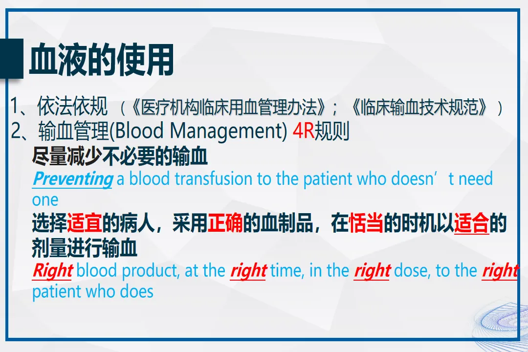 输血虽然经过严格筛查,但仍有2%-10%的不良反应发生率,比如发热、过敏,严重的溶血反应死亡率高达20%-60%。PPT里用“4R规则”总结输血原则:给正确的病人、用正确的血制品、在正确的时机、输正确的剂量,把专业指南变成了可操作的方法。