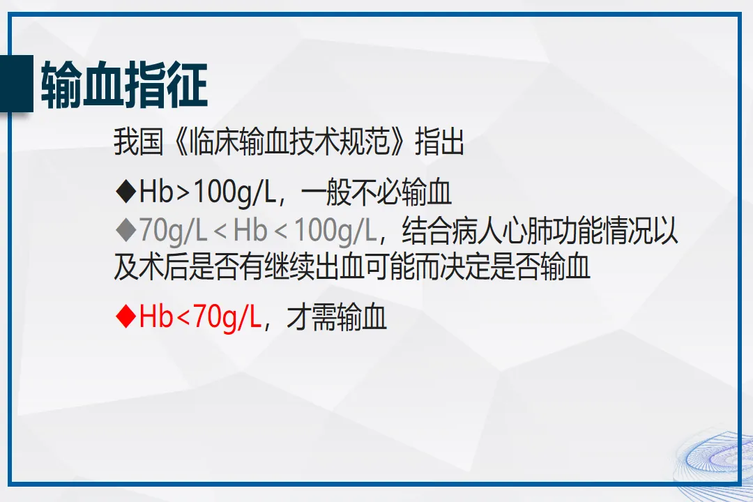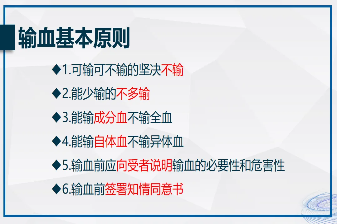 这份PPT的核心价值,就是让输血管理从“盲目跟风”到“科学决策”:✅ 帮你避坑:这3种情况别输血!PPT里明确了输血指征:Hb>100g/L不必输,70g/L<Hb<100g/L结合病情决定,只有Hb<70g/L才需要输。比如术后患者如果血红蛋白在80g/L以上,心肺功能正常,完全可以通过饮食和药物恢复,不需要输血。✅ 教你选对:成分血比全血好在哪?成分血是把血液中的红细胞、血浆、血小板分开,根据患者需要单独输注:比如急性失血输悬浮红细胞,凝血功能障碍输新鲜血浆,血小板减少输浓缩血小板。这样既提高疗效,又减少不良反应,还能节约血液资源。✅ 应对风险:出现这些反应立即停输!如果输血时出现畏寒、寒战、高热(发热反应),或者皮肤瘙痒、荨麻疹(过敏反应),要立即减慢速度或停止输血;如果出现头痛、腰背酸痛、血压下降(溶血反应),这是最严重的并发症,必须立刻停止输血,通知医生抢救。