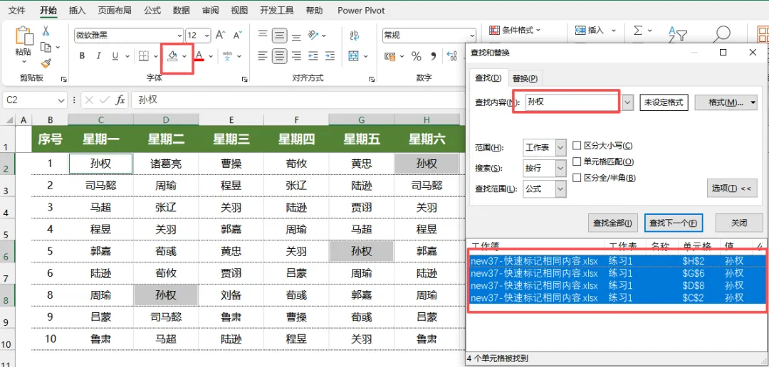 - 点击窗口下方的「查找全部」,此时会列出表格中所有包含“孙权”的单元格,清晰显示单元格位置;