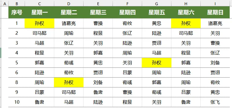 比如我们要从表格中找出标记孙权所在单元格