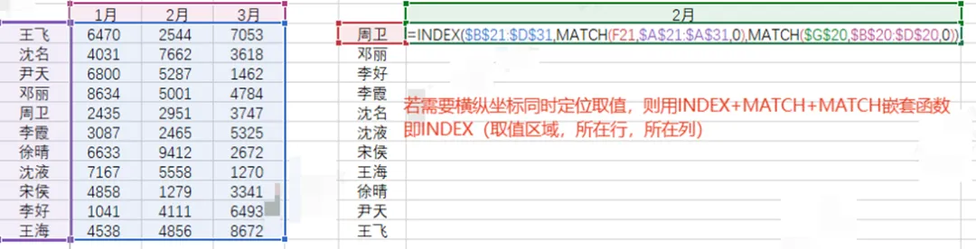 公式:=INDEX(数据区域, MATCH(行查找值, 行查找区域, 0), MATCH(列查找值, 列查找区域, 0))