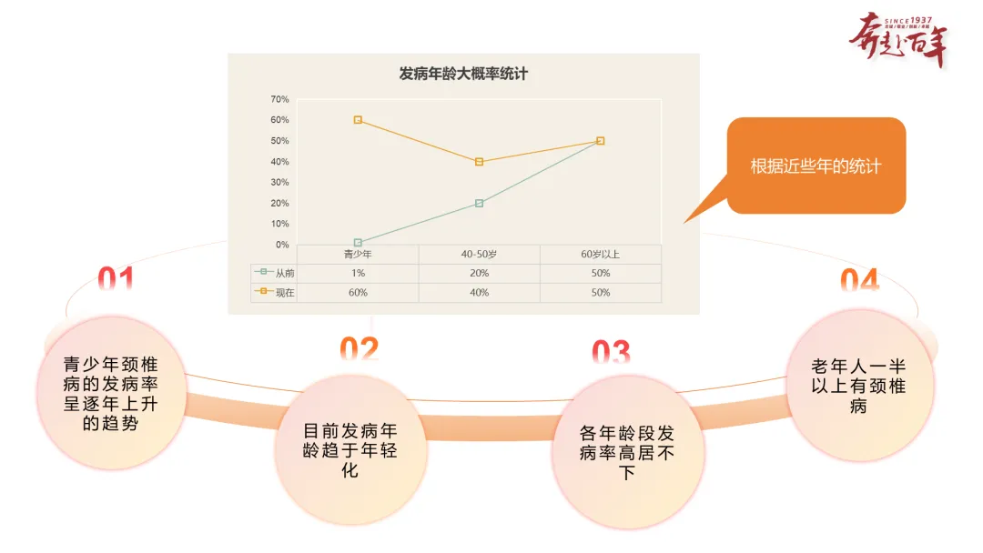 内容:主标题为创意化的 “颈” 善尽美,标注主讲人:楠小护 PPT,整体无多余冗杂元素,视觉聚焦主题。亮点:巧用 “尽善尽美” 谐音梗设计标题,贴合颈椎病主题,记忆点十足;排版简洁大气,专业感拉满,作为护理科普 / 小讲课 PPT 封面,颜值与主题契合度双高。内容:给出颈椎病的专业定义(又称颈椎综合症,因颈椎相关组织退行性及继发改变,刺激 / 压迫脊髓、神经、血管等引发一系列临床症状体征);搭配逻辑示意图,标注 “颈椎发生退行性改变→刺激或压迫周围组织器官→出现一系列症状” 的病理过程。亮点:疾病定义专业准确,完全贴合临床护理的专业表述;将抽象病理过程转化为直观逻辑图,把复杂知识简单化,护士宣讲时易讲解,听众(患者 / 同事)易理解,是护理 PPT 的核心实用素材。内容:总结 4 大发病特点(青少年发病率逐年上升、发病年龄趋于年轻化、老年人一半以上有颈椎病、各年龄段发病率高居不下);搭配对比表格,展示从前 / 现在青少年、40-50 岁、60 岁以上人群的颈椎病发病率数据。