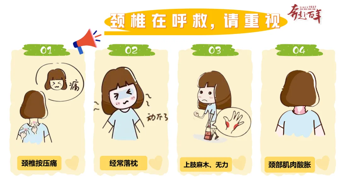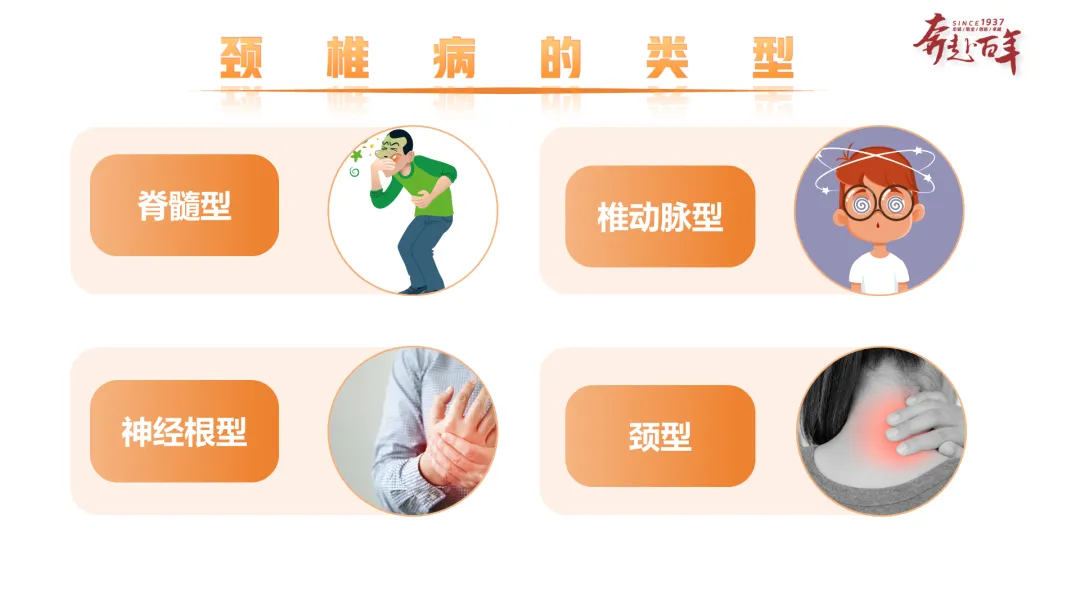 内容:展示颈椎病主要类型,包括脊髓型、神经根型、椎动脉型、颈型,每种类型搭配对应的病症相关图片。