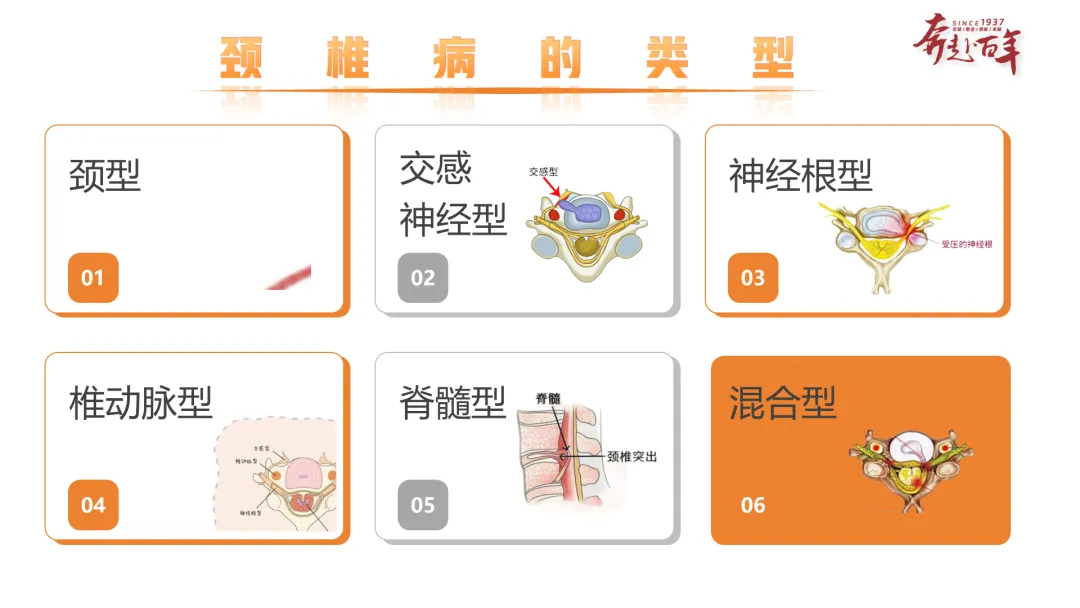 内容:补充完整 6 大颈椎病类型,按顺序为颈型、交感神经型、神经根型、椎动脉型、脊髓型、混合型,每种类型均搭配专属的病理 / 症状示意图。