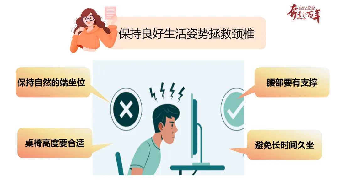 内容:给出坐姿护颈的具体实操建议(保持自然端坐位、桌椅高度要合适、腰部要有支撑、避免长时间久坐),搭配标准坐姿的示意图。
