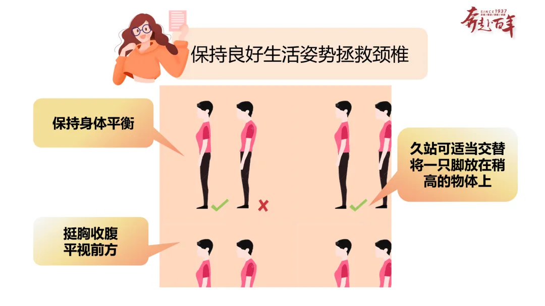 内容:补充站姿护颈的实操建议(保持身体平衡、挺胸收腹平视前方、久站可将一只脚放在稍高物体上),搭配标准站姿的示意图。