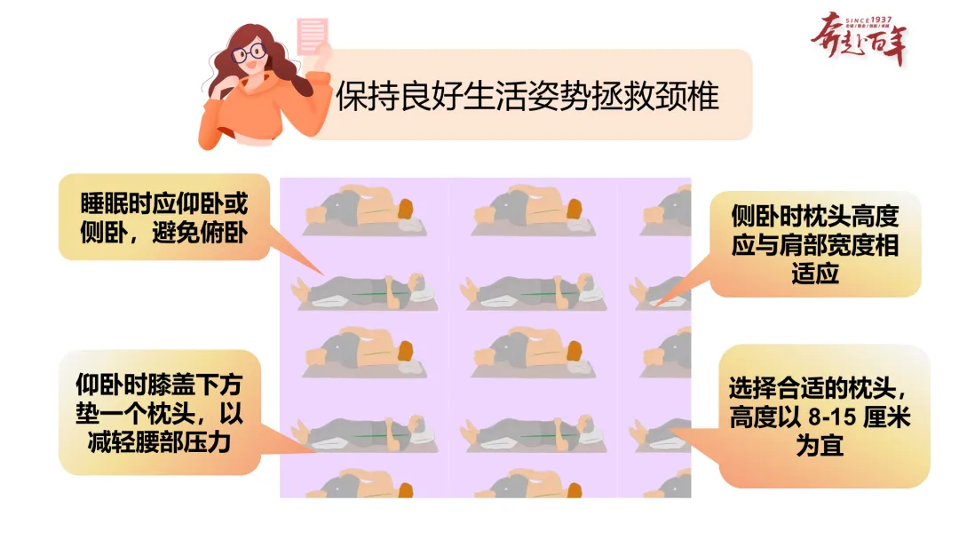 内容:给出睡姿护颈的专业建议(仰卧 / 侧卧,避免俯卧;仰卧膝盖下垫枕减轻腰部压力;枕头高度 8-15cm 为宜;侧卧枕头高度与肩部宽度相适应),搭配睡姿示意图。