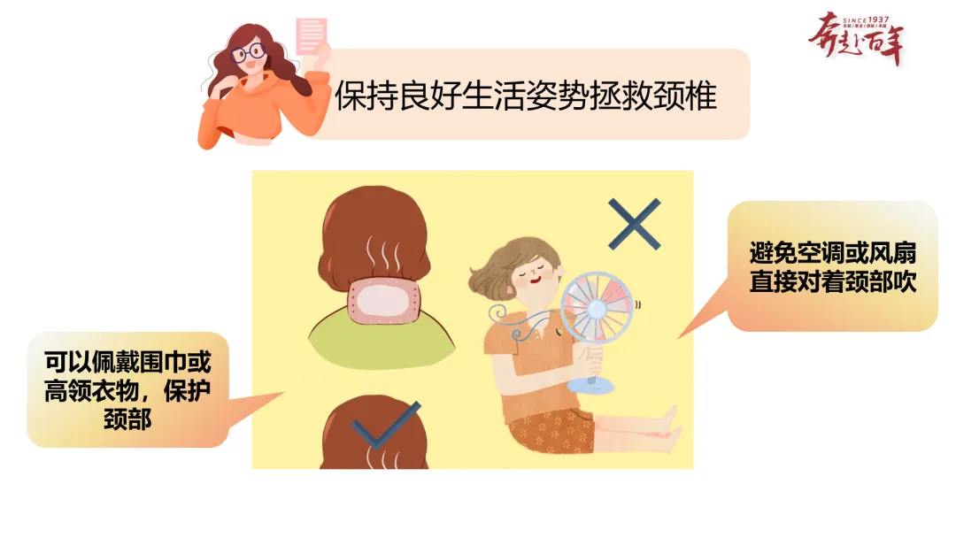 内容:给出颈部保暖的护颈建议(佩戴围巾 / 高领衣物保护颈部、避免空调 / 风扇直吹颈部),搭配对应的场景示意图。