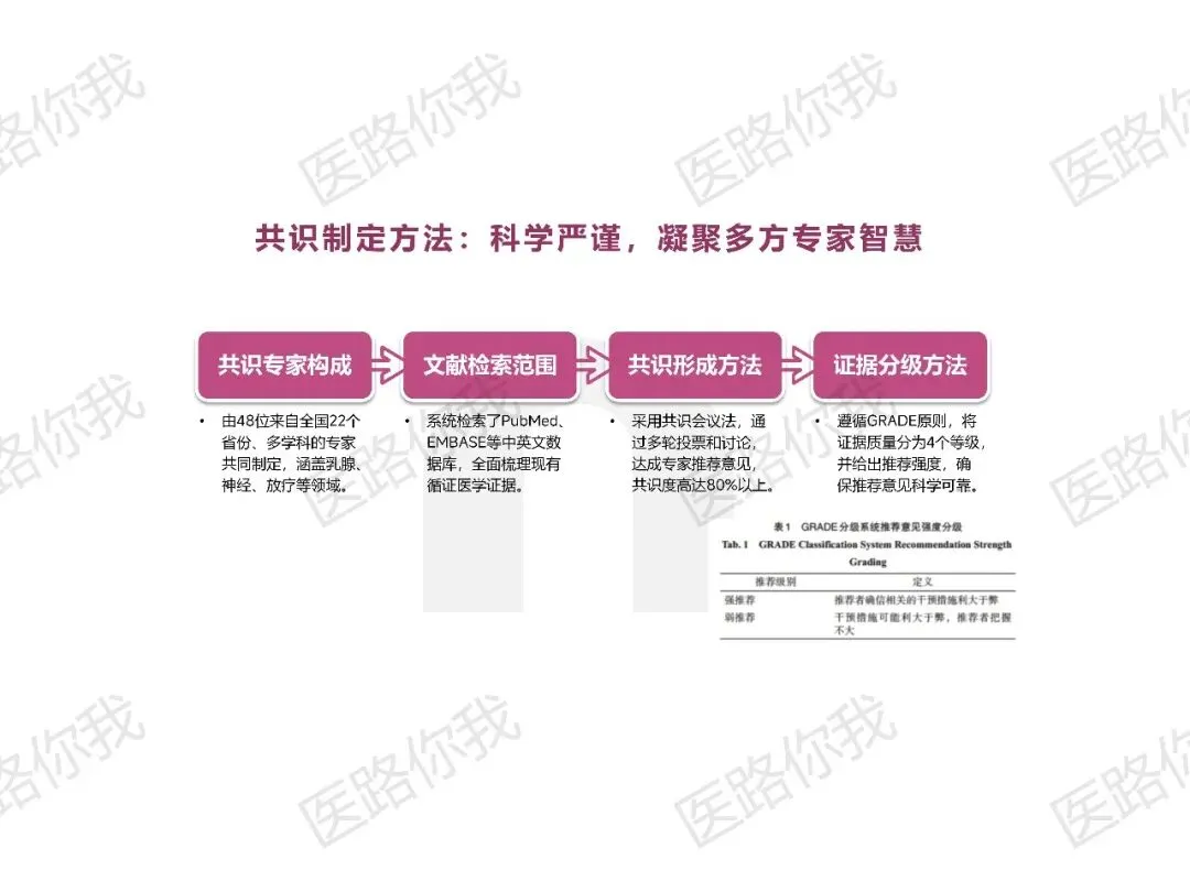 乳腺癌软脑膜转移是晚期乳腺癌的严重并发症之一,其临床表现复杂多变,病程进展迅速。随着诊疗技术的进步,患者生存期不断延长,这一疾病的发病率也呈逐年上升趋势。目前数据显示,其在所有乳腺癌患者中的总体发病率约为5%,在转移性乳腺癌患者中可上升至10%~20%。既往由于缺乏统一的诊疗标准,且传统化疗药物难以穿透血脑屏障,临床治疗陷入“无药可用”的困境。本共识专家组基于GRADE系统,结合中国国情,系统梳理了13条推荐意见,确立了全身治疗为基础,局部治疗为补充的综合治疗新范式。