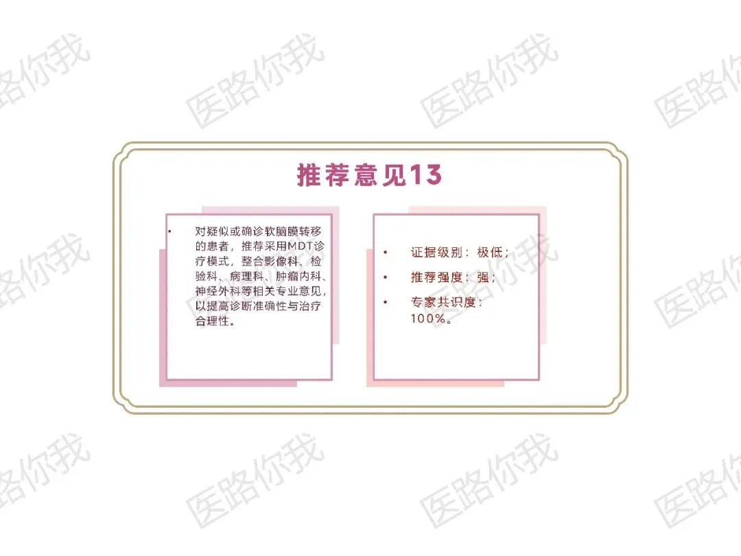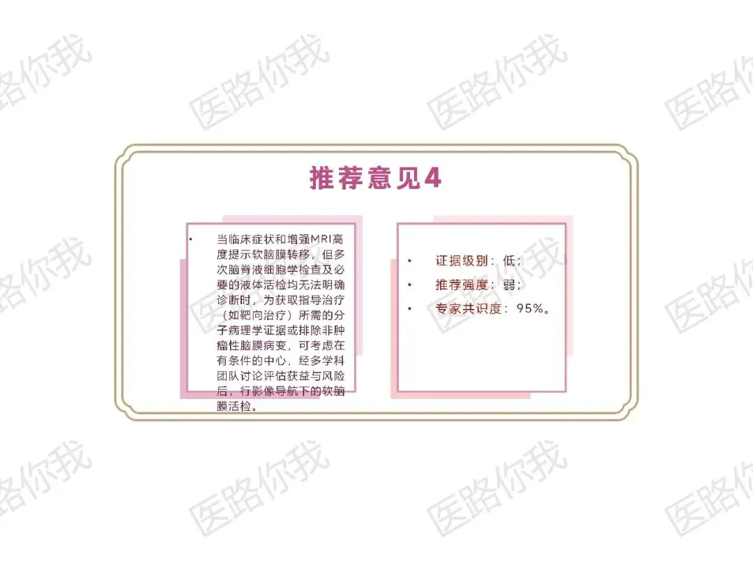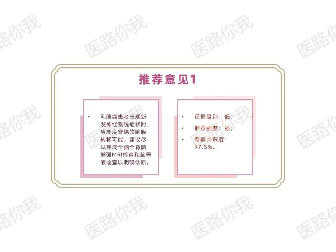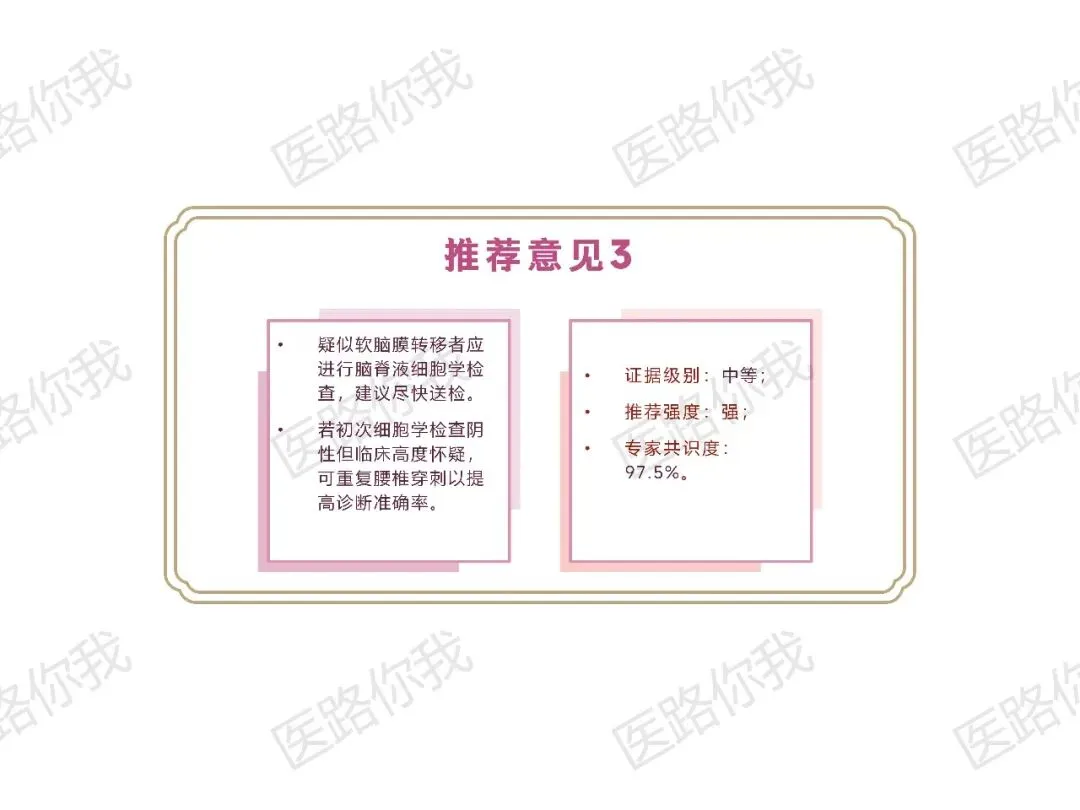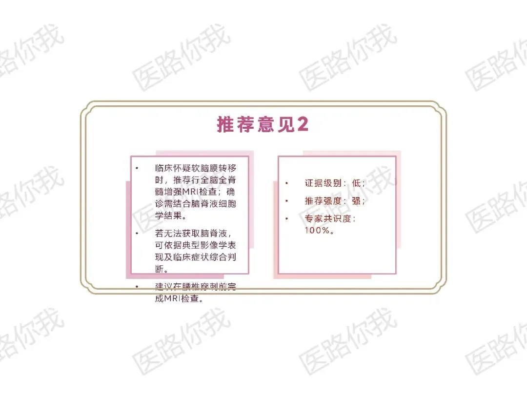 共识强调,乳腺癌软脑膜转移的诊断需结合临床表现、影像学及脑脊液检查,避免单一指标的局限性。1. 影像学检查:全脑全脊髓增强MRI是基石