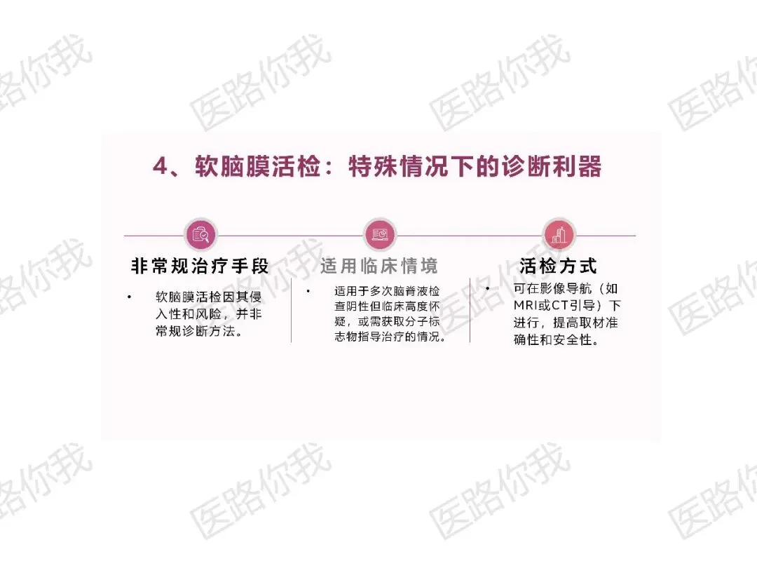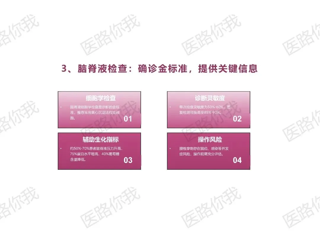 金标准:脑脊液细胞学检查是确诊的金标准,离心沉淀法可提高阳性率。策略:初次阴性但临床高度怀疑者,建议重复腰椎穿刺(灵敏度可提升至85%~90%)。风险控制:严格掌握适应证,操作前需评估颅内压及凝血功能。