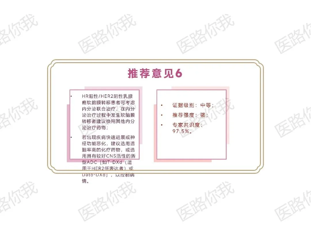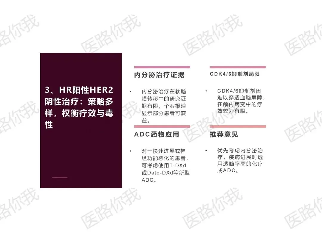 HER2阳性软脑膜转移是目前治疗进展最快的亚型。共识明确指出,原发灶与转移灶分子特征一致性高达94%,因此抗HER2治疗是核心。首选推荐:德曲妥珠单抗(T-DXd)。基于ROSET-BM和DEBBRAH研究,其颅内ORR高达77.8%,PFS达17.5个月。替代方案:TKI联合化疗(如图卡替尼方案,ORR 38%)。鞘内治疗:对于全身治疗耐药者,推荐鞘内注射曲妥珠单抗(优于传统化疗药物)。2. HR阳性/HER2阴性型:突破血脑屏障的探索