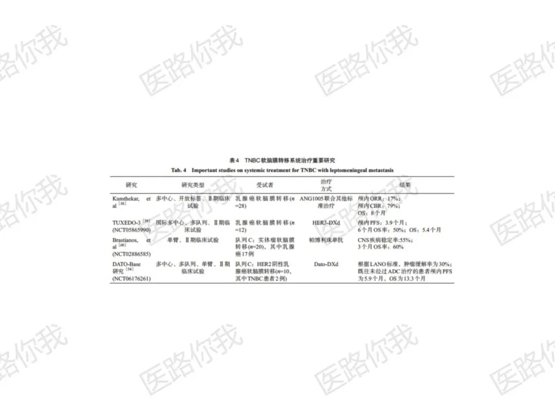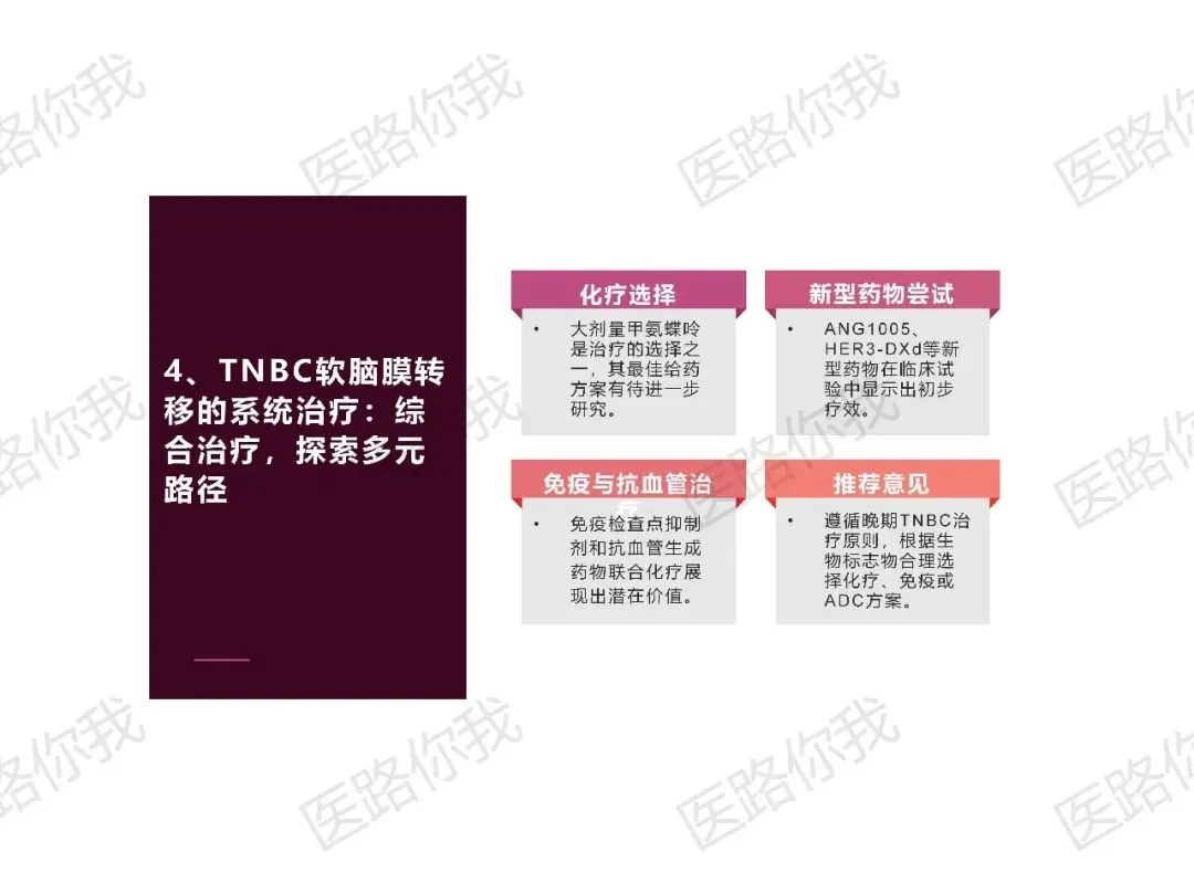 内分泌治疗:仅作为症状控制或缓慢进展者的选项(如他莫昔芬)。新型ADC:共识特别指出,多数患者实际为HER2低表达。T-DXd及Dato-DXd显示出显著的颅内活性。数据支撑: Dato-DXd在DATO-Base研究中使软脑膜肿瘤缓解率达30%,既往未经过ADC治疗者颅内PFS达5.9个月。3. 三阴性乳腺癌(TNBC):多机制联合攻坚
