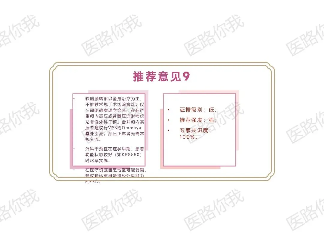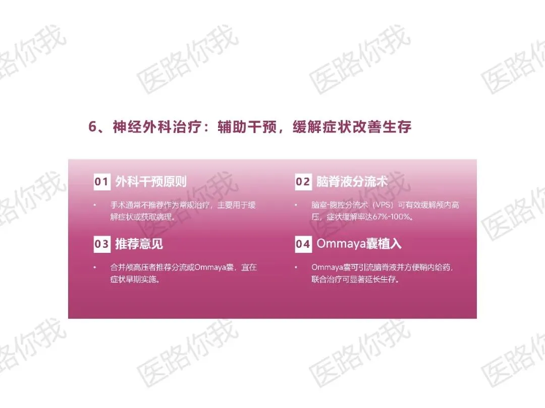 原则:不推荐常规切除病灶,仅用于明确诊断、严重颅高压或脊髓压迫。关键策略:对于合并颅内高压者,推荐行**脑室-腹腔分流术(VPS)**或Ommaya囊植入。时机窗:强烈建议在患者功能状态较好(KPS ≥ 50)时尽早实施,若延迟至KPS < 30或昏迷,术后死亡风险极高。2. 放疗:精准打击与毒性控制