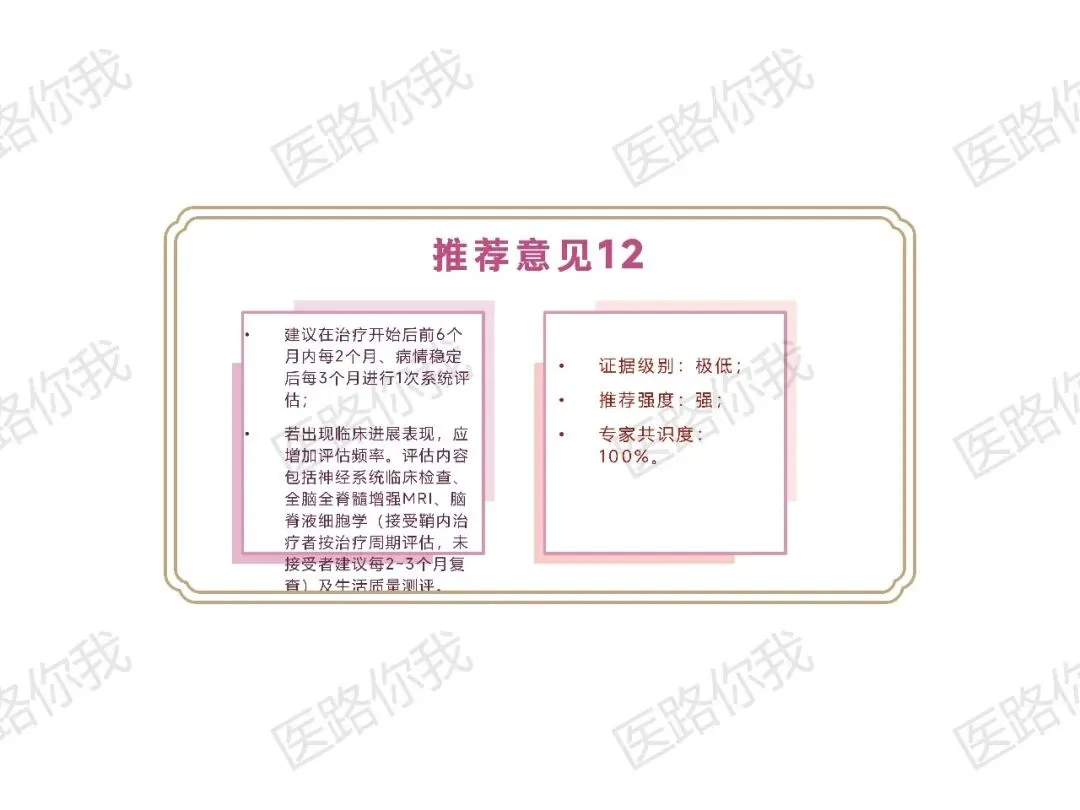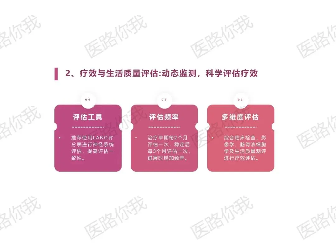 共识推荐使用**LANO(Leptomeningeal Assessment in Neuro-Oncology)**评分表进行标准化评估。频率:治疗前6个月每2个月1次,稳定后每3个月1次。维度:涵盖神经系统检查、MRI、脑脊液细胞学及生活质量。