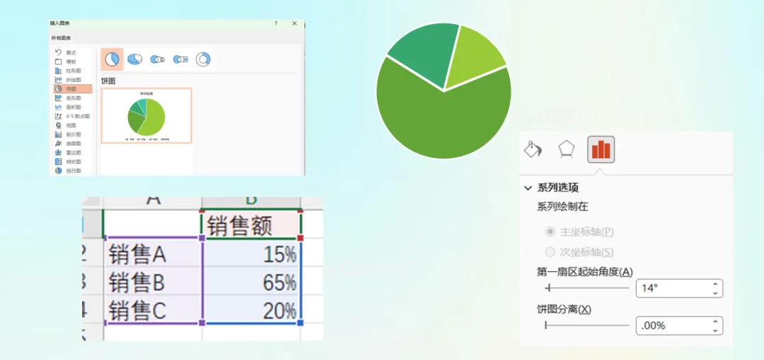 1,新建一页空白页,在菜单栏里点击插入图表,在弹出的对话框中选择饼图,在弹出的表格里编辑数据,并根据实际的情况调整扇形的起始角度,具体的参数可以参考下图: