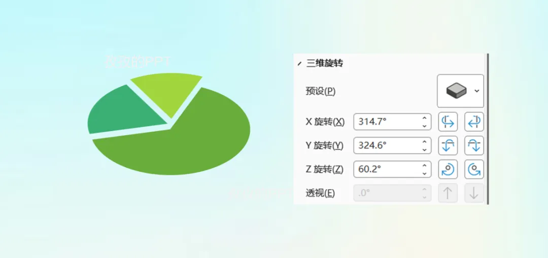 3,接着给三个扇形设置三维旋转,选择等角轴线顶部朝上,把扇形图做成透视效果做成透视的效果,具体参数可参考下图: